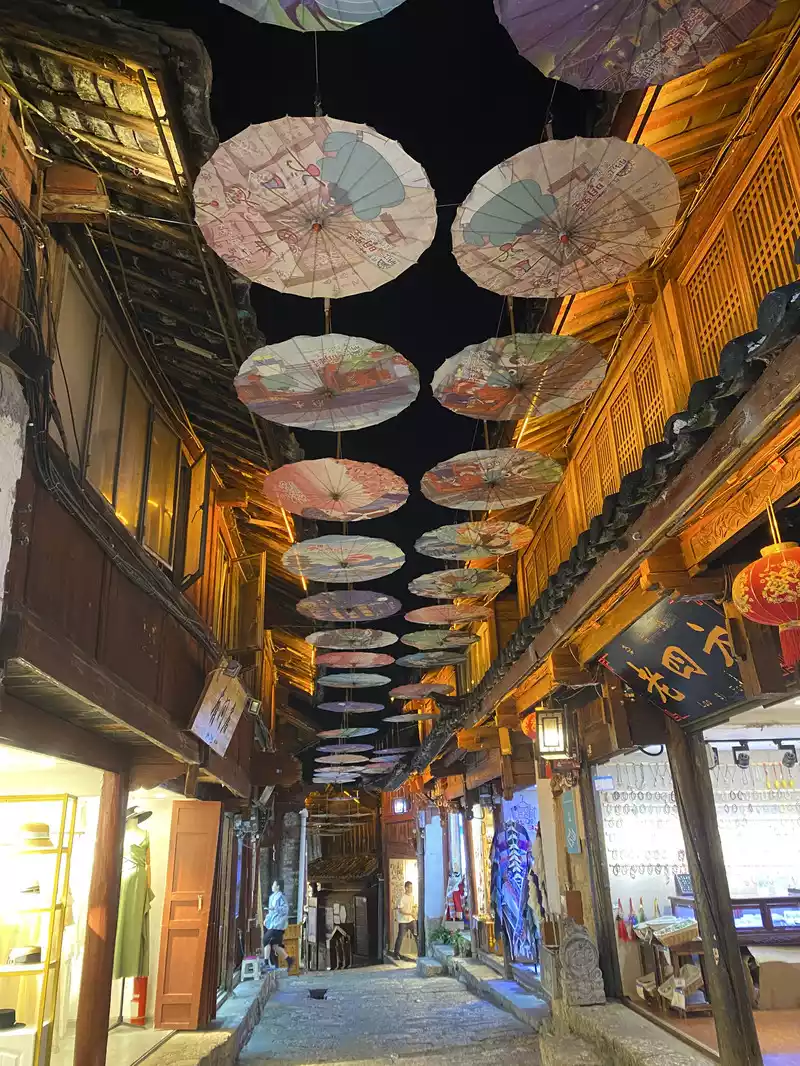 We then wandered to Oil-Paper Umbrella Street. The oil-paper umbrellas looked even more colorful against the dark night sky.
