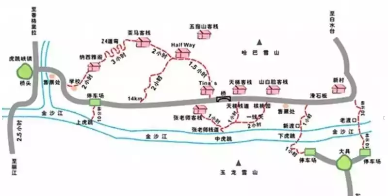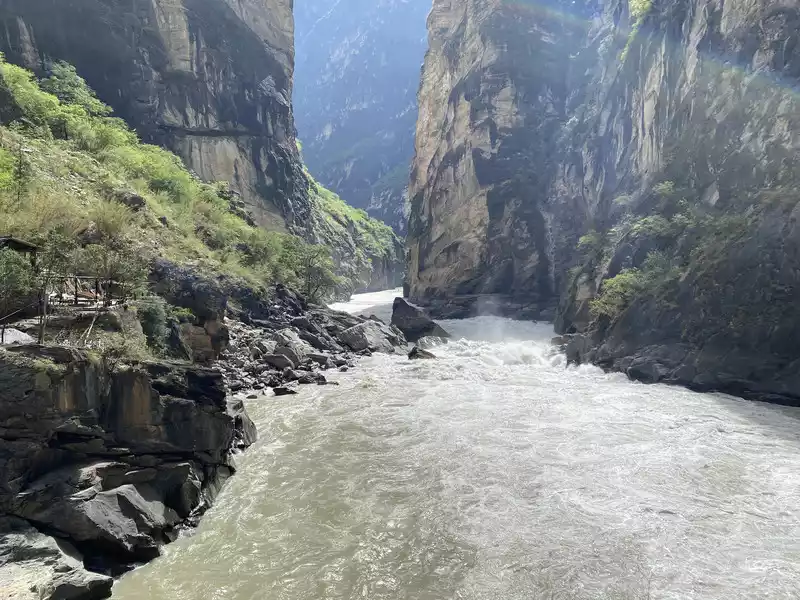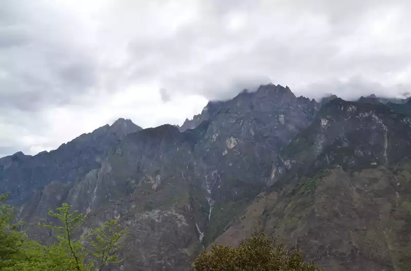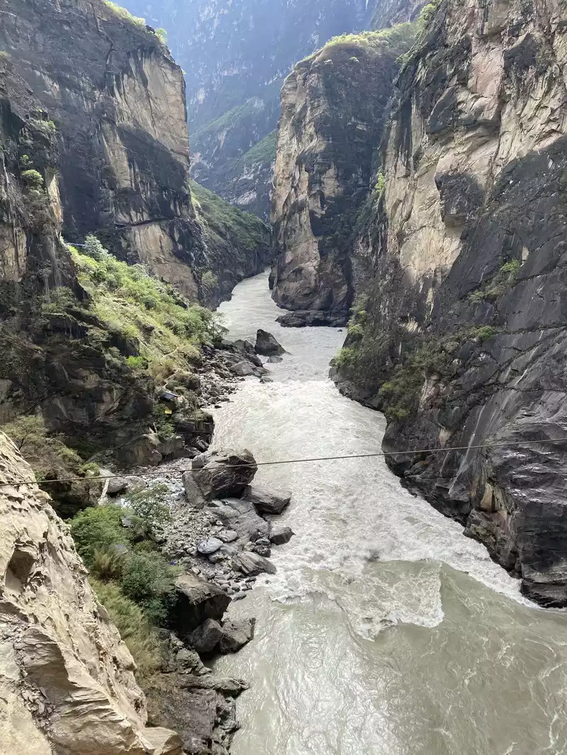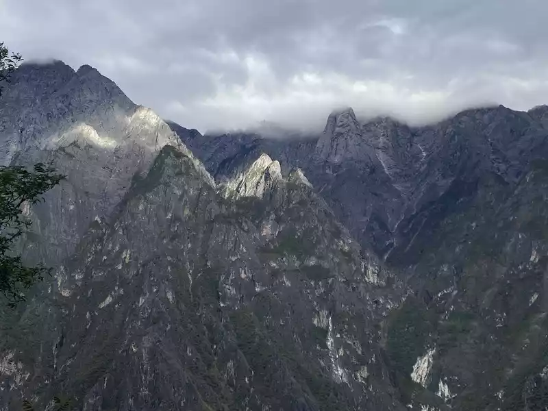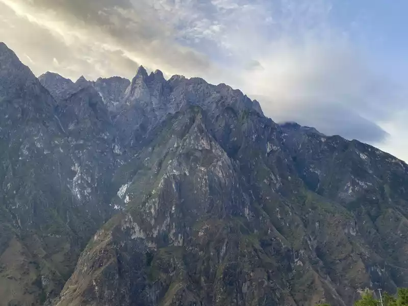 The hotel breakfast is clean and refreshing. After breakfast, I was chatting with friends in the open-air lobby. It was cloudy today, and the forecast for the next few days was all rain. I wanted to temporarily change my itinerary to go to Jade Dragon Snow Mountain before it started raining. When I saw that tickets were still available online, I immediately called my friends and family to book tickets. The enthusiastic housekeeper came over to join in the fun and said, "Can you still book tickets to Jade Dragon Snow Mountain now? Impossible." Indeed, when I clicked on the time zone options again, all the time zones were dimmed. Well, my heart was broken. I packed my bags and headed for Tiger Leaping Gorge. Take National Highway 214. The Xili Expressway is on the higher ground to your right. As soon as National Highway 214 turns onto the East Ring Road, a staff member stopped the car and demanded that you buy a Tiger Leaping Gorge ticket before continuing on the East Ring Road. Tickets are 45 yuan per person. The first viewing platform after the ticket gate is the Tiger Leaping Gorge Jinsha River Bridge on the Xili Expressway.