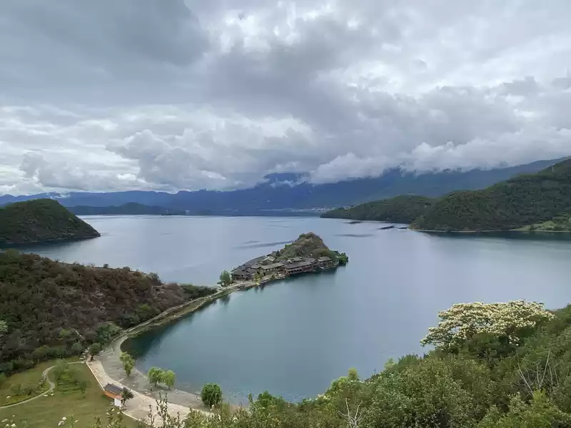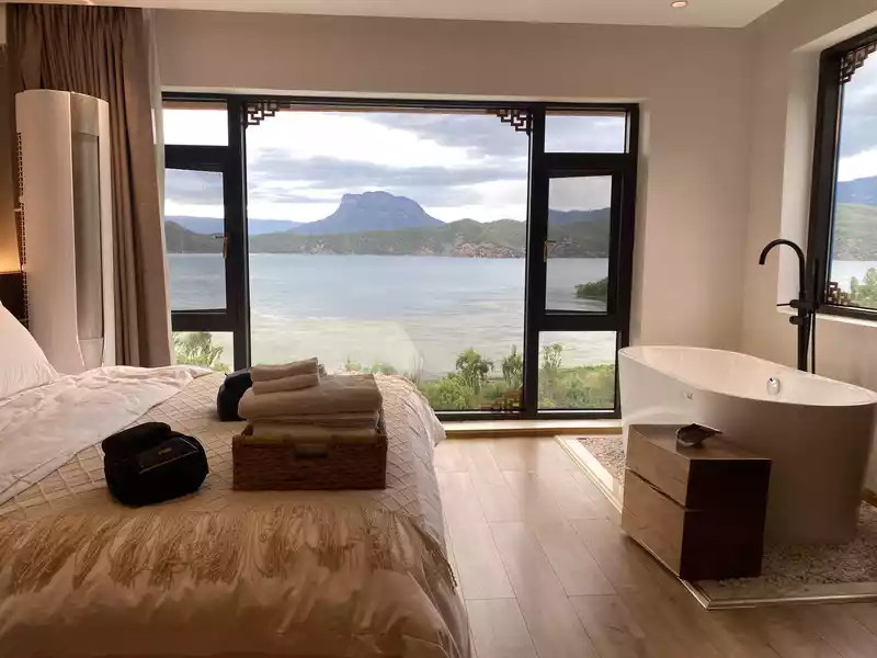 We made a last-minute decision to visit Lugu Lake today, so we found a hotel and got a free upgrade to a panoramic room, which was a great value.