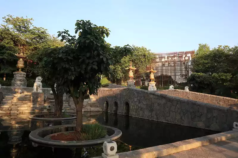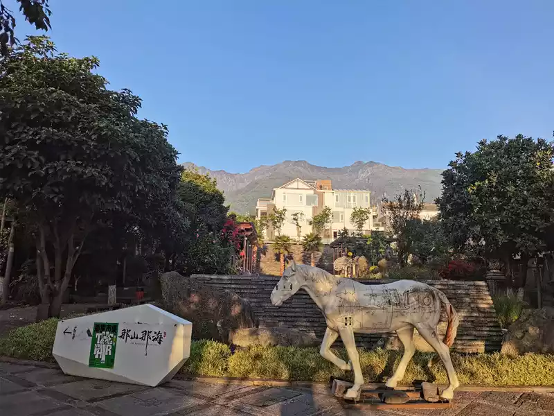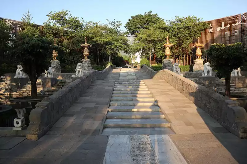 There are four big characters on the building behind the left side of the stone bridge: Those Mountains and Those Seas. After crossing the stone bridge, there is a stone horse in front. On the stone on the left is written: the mountains and the sea (could it be another villa?). Further ahead is a swimming pool surrounded by green plants and flowers, which is open to hotel guests.