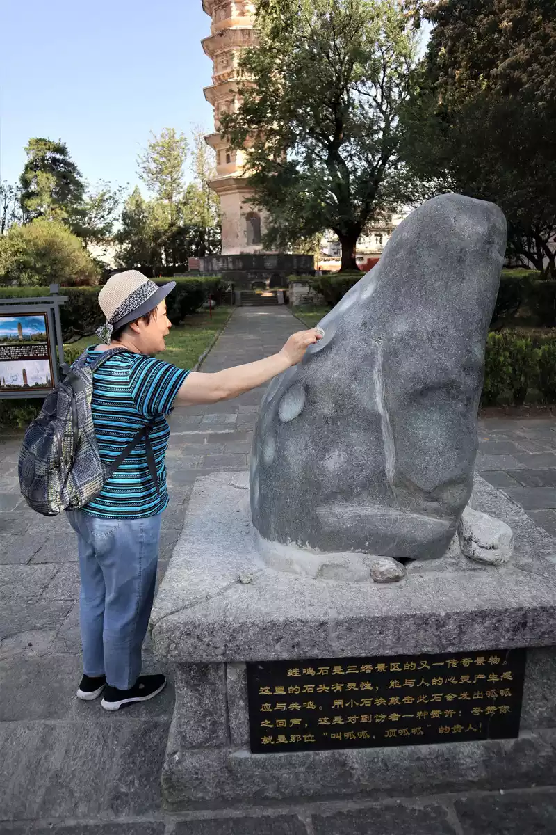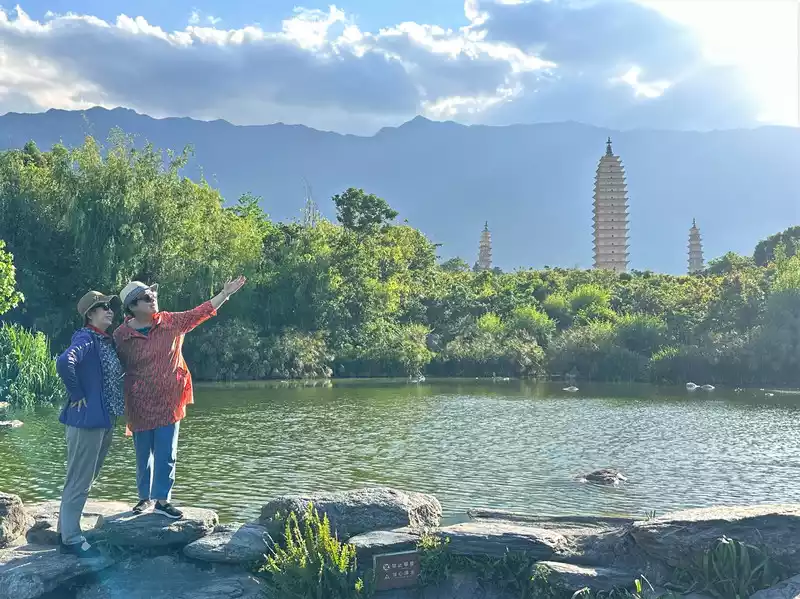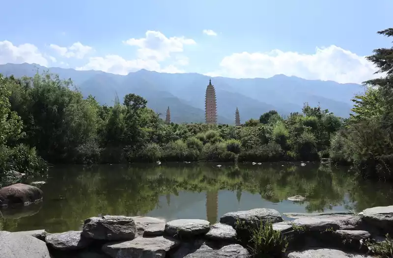 Standing under the Three Pagodas and looking west, the blue Erhai Lake stretches across the foot of the opposite mountain, stretching and long. The villages by the Erhai Lake are also clearly visible, with densely packed white houses. There are several large rocks beside the pool, which mark the best location for photographing the three towers.