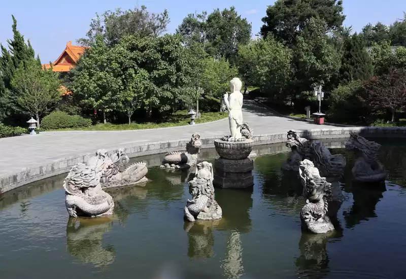 Wanghai Tower, also known as the Sutra Repository, is a triple-eaved Ming and Qing dynasty-style pavilion. The Sutra Repository is the last major building in Chongsheng Temple, housing the Tripitaka, other Buddhist texts, and religious instruments. In front of Wanghai Tower is the "Nine Dragons Bathing Buddha" stone sculpture. Based on the legend of the Nine Dragons Bathing the Prince, the sculpture depicts the Nine Dragons and the Prince bathing the Buddha. The sculpture is complemented by a high-tech fountain, showcasing the scene.