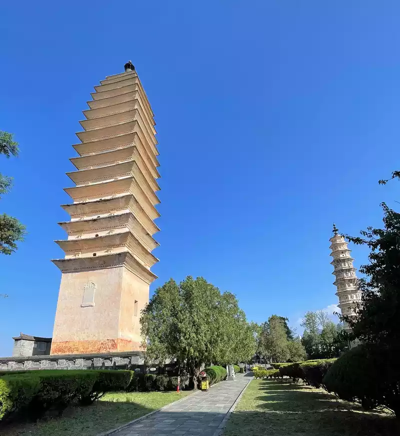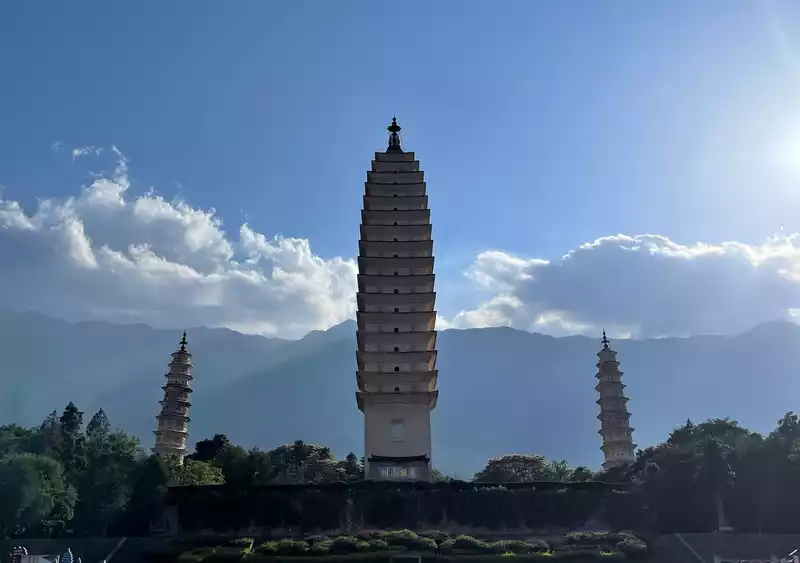 In addition to the main hall of the temple, Chongsheng Temple has the famous three pagodas, which seem to attract more tourists' attention. The three pagodas of Chongsheng Temple are staggered in height and harmoniously proportioned. The distance between the main pagoda and the two smaller pagodas to the north and south is 70 meters, forming a tripod. The main pagoda leads the two smaller pagodas, the main pagoda standing tall and majestic, while the smaller pagodas are exquisitely sculpted. The main tower, also known as the Qianxun Tower, stands 69.13 meters tall. It is a 16-story, square, hollow brick tower with dense eaves. It was built during the Tang Dynasty (circa 9th century). The north and south towers are 42.19 meters tall, 10-story, octagonal brick towers with dense eaves. They were added during the Song Dynasty. During the renovation of the three towers between 1978 and 1981, a large number of cultural relics from the Nanzhao and Dali Kingdom periods were discovered.