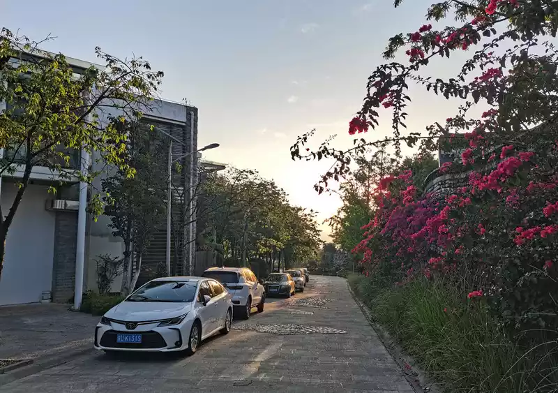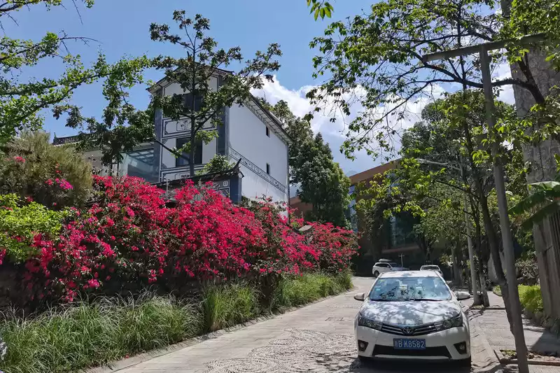 Outside the hotel gate, the sun is shining and the flowers are in full bloom. A new day awaits us as we drive around Erhai Lake.