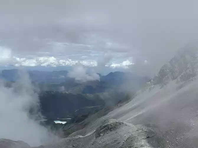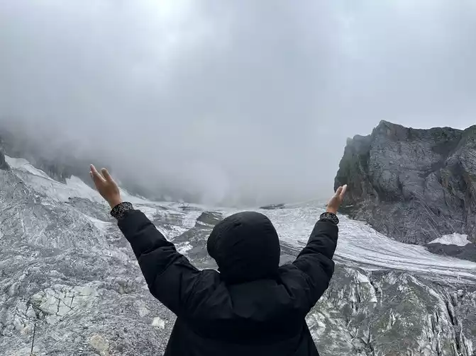 Day 5: We set off early the next morning. Since we were staying close, there was no traffic, perhaps due to the traffic restrictions, as we had purchased tickets for the 12:00 PM cable car. We grabbed a bite to eat at KFC and waited until 11:53 AM for ticket inspection and a bus to the cable car entrance. The cable car reached 4506 at 12:53 PM. My sister and her family of three waited for 10 minutes, feeling dizzy and short of oxygen. We disembarked and took the free bus to Blue Moon Valley. My husband and I headed for the summit. The weather was unpredictable, with heavy rain along the way, so we made sure to bring our down jackets, umbrellas, and raincoats. You can rent clothes at the parking lot for ¥50/piece. We arrived at 4680 at 2:16 PM!!