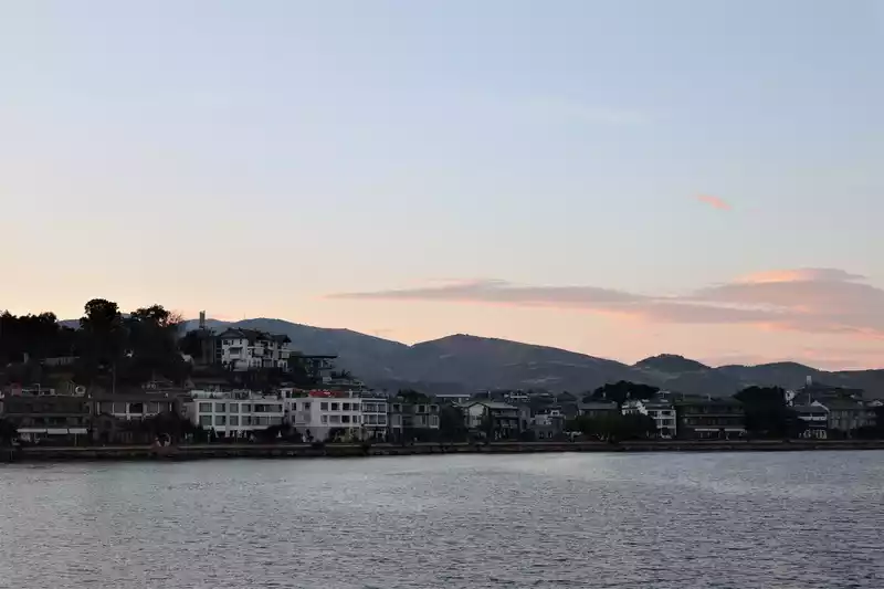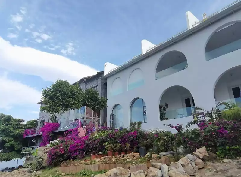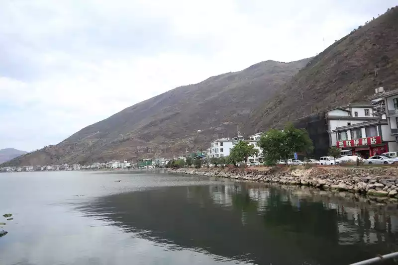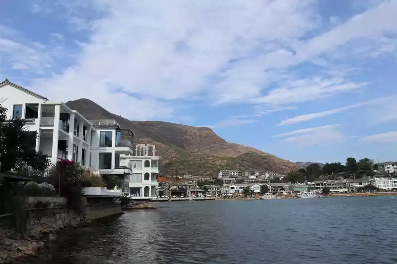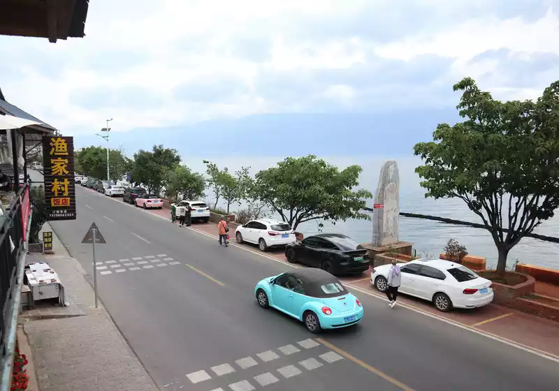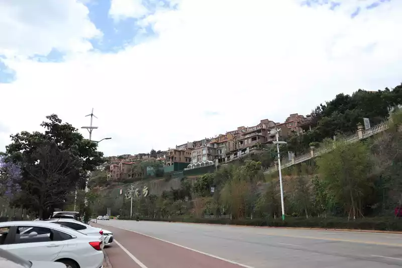 The road passes Utopia, also known as Santorini. Looking up, I see many houses on the cliffs beside the road, built on the mountainside, rising layer by layer. For some reason, I don't find these copied foreign place names interesting, and even feel a little awkward. Not far ahead, I find that there are also clusters of buildings on this side of the mountain. One side of the road is close to Erhai Lake, and there is also parking on the side of the road.