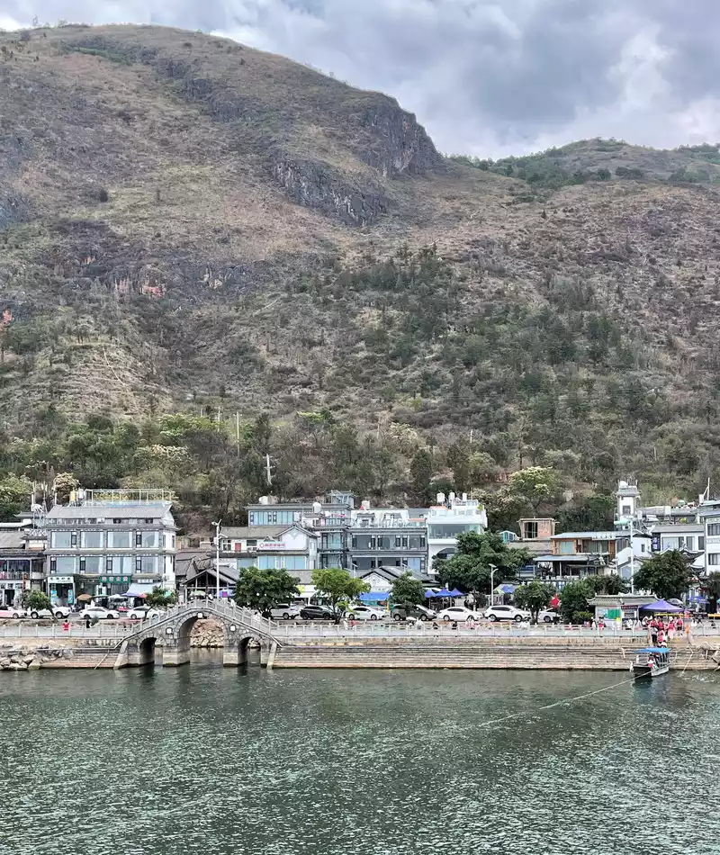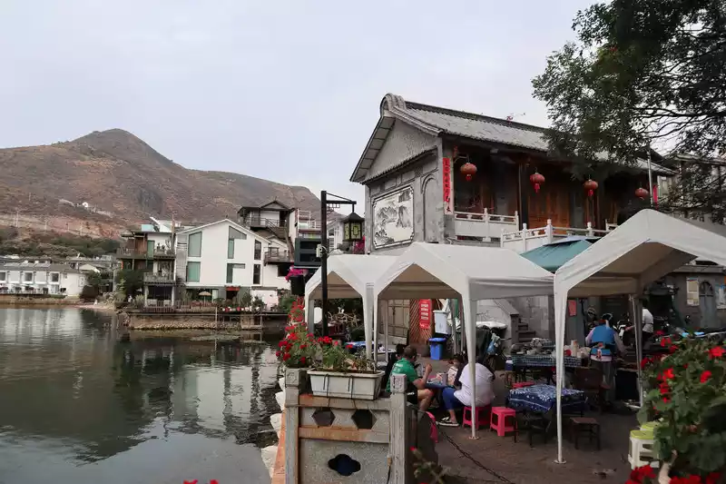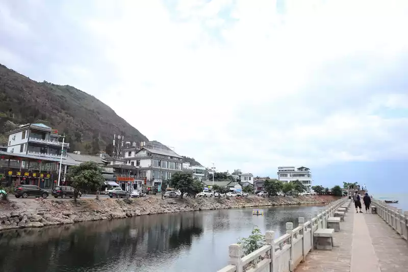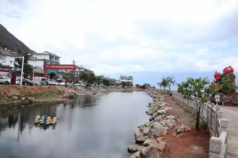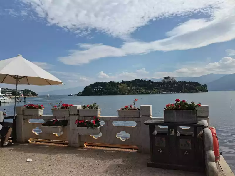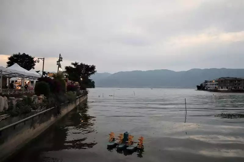 The shops along the shore are very good at doing business. They set up parasols and seats close to the lake for tourists to enjoy. Shuanglang Town, located northeast of Dali City and on the northeastern shore of Erhai Lake, is a provincial-level historical and cultural town in Yunnan Province and is considered one of the most scenic towns in the world. Surrounded by mountains on three sides and facing the sea on one side, the town overlooks the 19 precipitous peaks of Cangshan Mountain to the west, borders the vast expanse of Erhai Lake, and borders the Buddhist mecca of Jizu Mountain to the east and the Penglai Fairy Island of Xiaoputuo Temple to the south.
