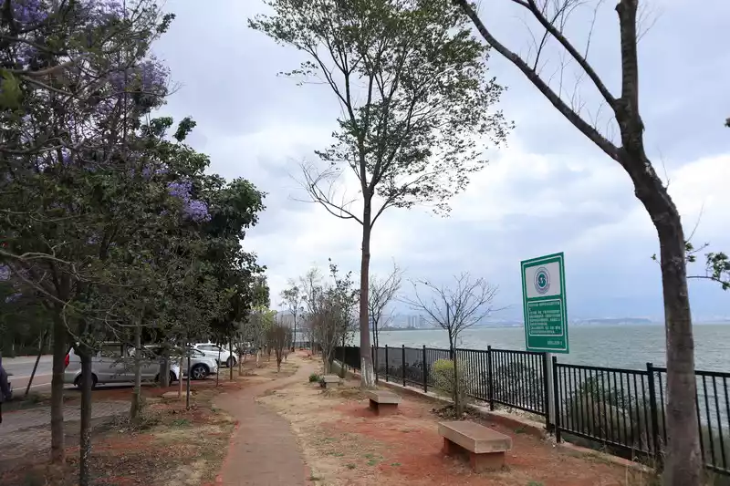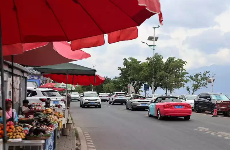 There are quite a few cars parked on the roadside, with almost no empty parking spaces. I guess they are tourists like us who are touring Erhai Lake.