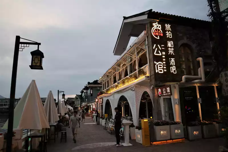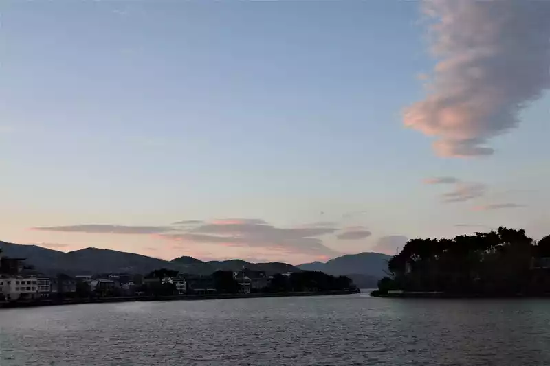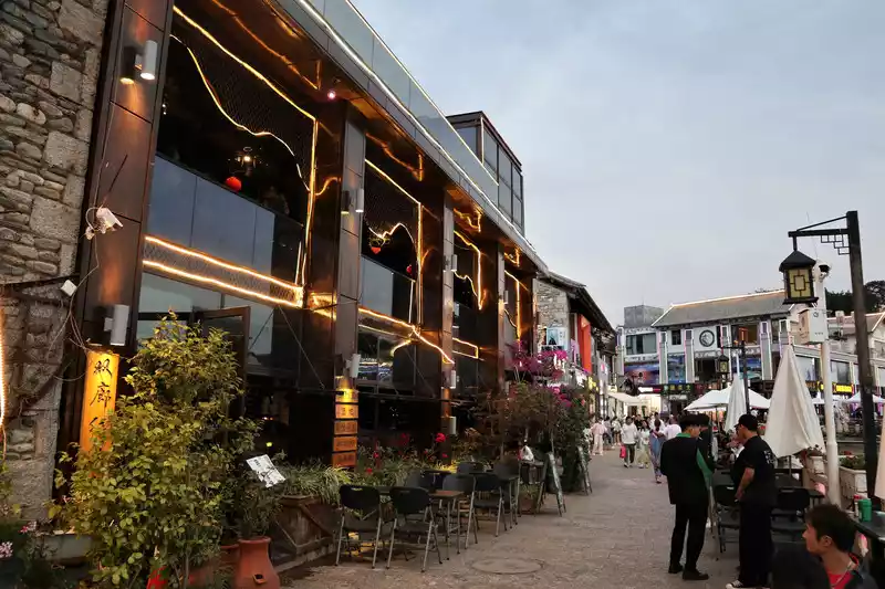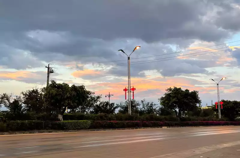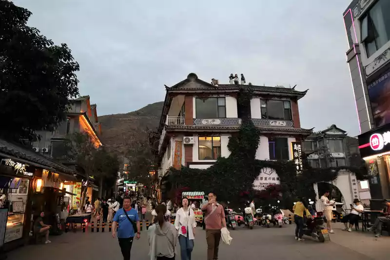 After lunch, I took a stroll in the ancient town to digest my food and enjoy the scenery. It was getting dark, the street lights came on, and a hint of sunset glow still lingered in the western sky. Shuanglang Town, located in the east of the Haidong region, is supposed to be an excellent place to watch the sunset and the sunset glow. However, today the clouds were too many and too thick, leaving almost no clear sky, and the expected sunset glow was dashed.