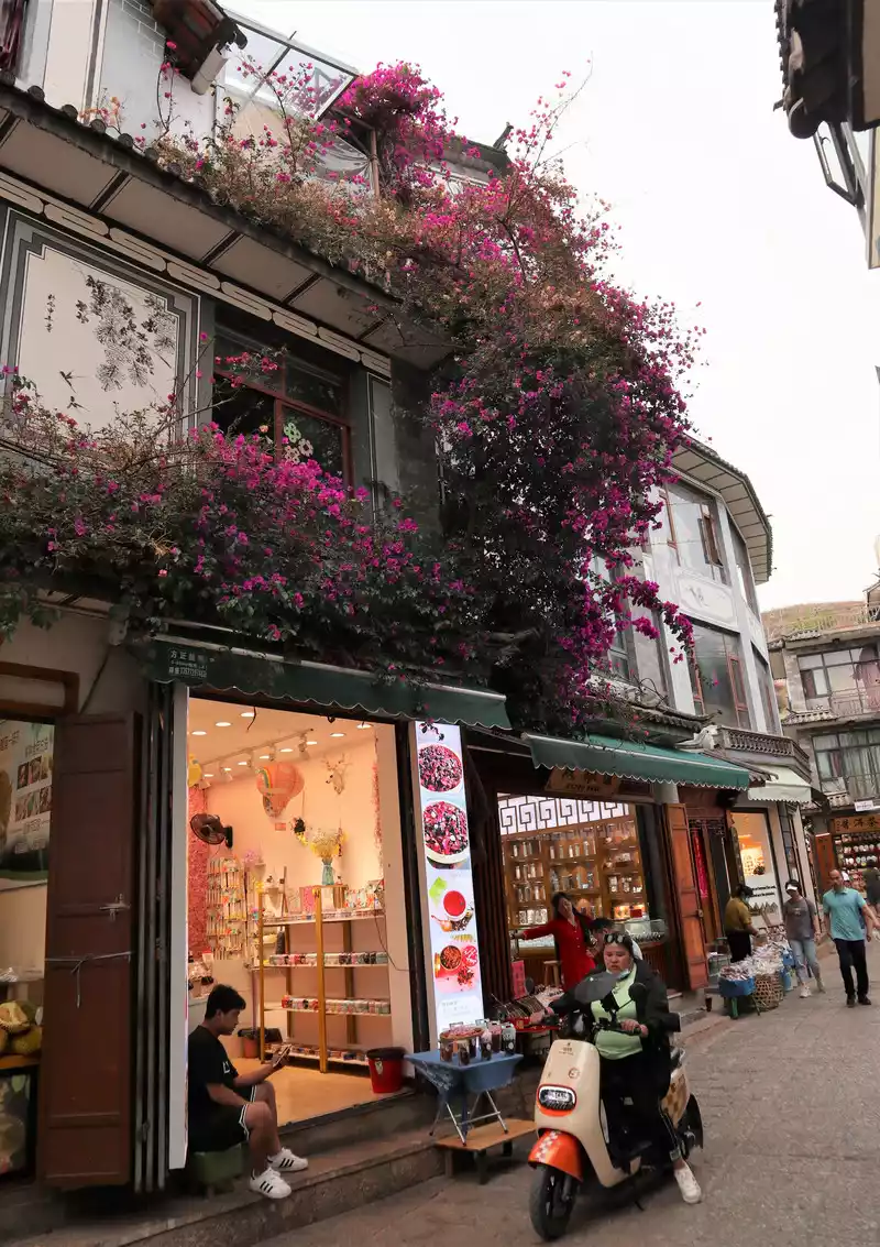 Cars are not allowed into the ancient town, and parking is limited to a parking lot outside the town. The guesthouse we booked sent someone on an electric bike to pick up our luggage, and we walked into the ancient town together. Walking along the main street by Erhai Lake, you'll find it the busiest, most prosperous, and bustling with tourists.