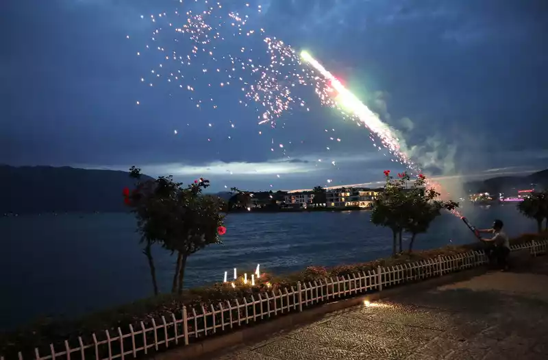 Someone set off fireworks by the lake, making the night scene of the ancient waterfront town even more beautiful.