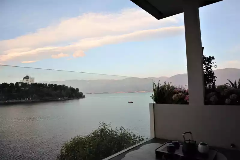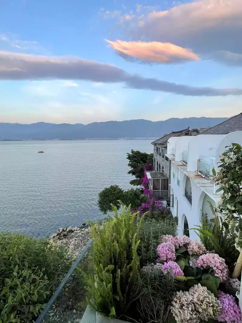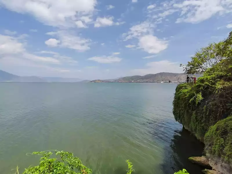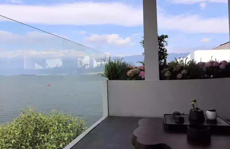The terrace faces Nanzhao Island. To the left is part of Shuanglang Town. To the right, you can see the vast Erhai Lake and the towering Cangshan Mountain.