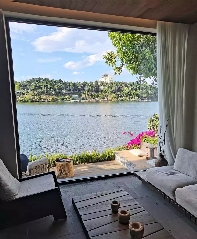 The hotel lobby is also a multi-functional space, serving as a platform for sitting, drinking tea and enjoying the view. The huge floor-to-ceiling windows frame a natural landscape painting.