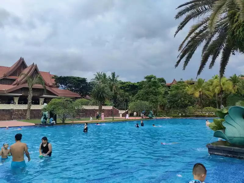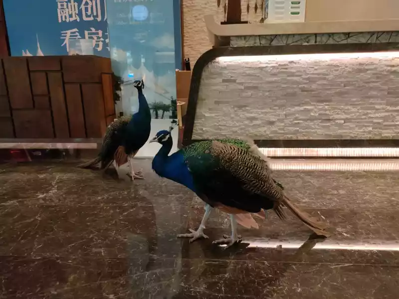 We stayed here on the first day. There are peacocks roaming in the lobby, but it's best not to get too close as they seem wild. There are two mynah birds hanging by the door, and they can talk a little. There's a craft shop to the right of the lobby. When we went, they only had papermaking and pottery, and finished paper products are available 24 hours a day. A little further from the lobby's customer service area is the refreshments area. To the left is the Western restaurant (café), and to the right is the Chinese restaurant. Further ahead is the outdoor pool, and further still is the fitness room and indoor pool.