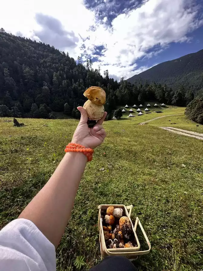 This inn is primarily managed by the proprietress, while Brother Luosang oversees the Fanchendela Wild Luxury Camp. The proprietress contacted me in advance to arrange a dinner group and time, so the food was served upon our arrival. The food was delicious and tasty. Seeing that I brought wine, she even invited me to try a local wine that her best friend really liked. The inn's courtyard is spacious. In the evening, I could smell the delicious aroma of braised beef brisket (the morning's breakfast), listen to music and sip tea, and watch the landlady attentively teaching guests about their day's climb of Haba Snow Mountain. On the morning of the 9th, I finally met the very busy Brother Luosang. After discussing the campground with him, I felt it was a good idea and decided to check in at noon. The drive from the inn to the campground is 9.5 kilometers, a very narrow, winding road. The last long stretch is gravel, so I drove slowly and took nine steps to reach the campground. The campground is located halfway up the mountain, and the alpine meadows are breathtakingly beautiful. After checking in, a friendly kid from the campsite, who was a perfect match for us, volunteered to take us porcini mushroom hunting. With an "expert" guiding us, we were able to find a ton of them. For the first time, everyone was like "little girls." The older brother told us about the Torch Festival, the camp's sheep butchering, and the lamb stew—it was delicious. That evening, the campsite had a bonfire and fireworks display, which was even more exciting. The two kids even showed off their electronics skills. If we had checked in early, we'd have plenty of time to ride horses to the alpine pastures and lakes.