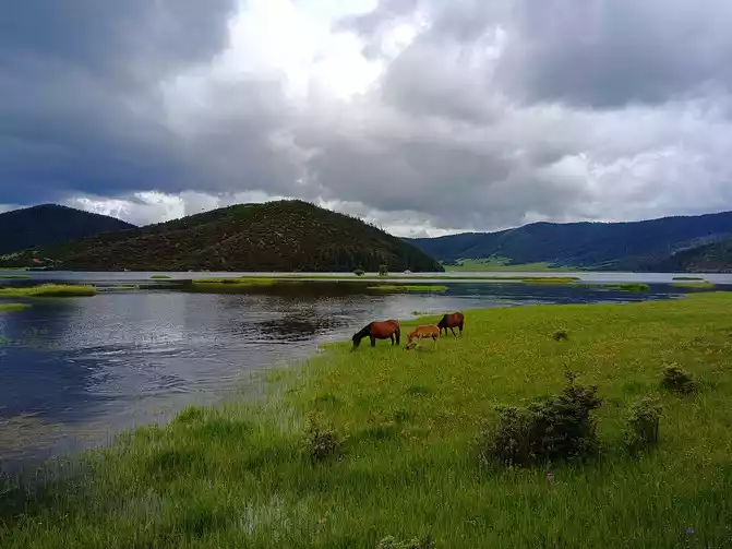 On the 10th, it rained in the middle of the night and stopped in the morning. After that, the clouds and mist dispersed, and the campsite became like a fairyland. It was worth the ticket price. I also saw the peak of Haba Snow Mountain. We set off at 10 a.m., following the eastern loop. Halfway through, seeing the weather was clear, we added a visit to Baishuitai and then to Pudacuo National Park. We arrived at Shangri-La and asked my friend to search online. They recommended "Xueyu Tibetan Hot Pot," a hot pot restaurant near the ancient city. We highly recommend the yak hot pot and the Tibetan pork.