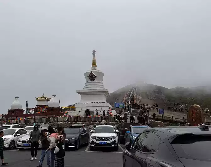 On the 15th, we set off at 7:00 AM. We were on the 18-turn Xitian Road. Because many cars were parked on the side of the road, and someone was going the wrong way, we were stuck on the left for half an hour. The rest of the way was smooth. We passed Kangding Airport and were able to see the plane landing. There were so many people and so much fog at Zheduo Mountain that we didn't stop. We arrived at Kangding Love Song Square around 3:00 PM. Parking was completely blocked along the riverfront, but we found a spot along the fruit line just inside. We took a few photos, had some hot pot, and then headed to Dujiangyan. We checked into the Balun International Hotel (a two-night stay, recommended) at 8:00 PM and had dinner at the mall downstairs.