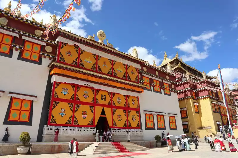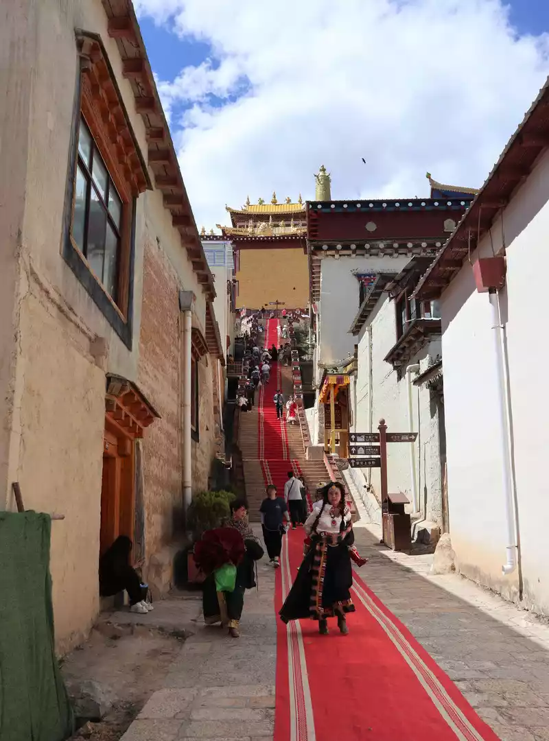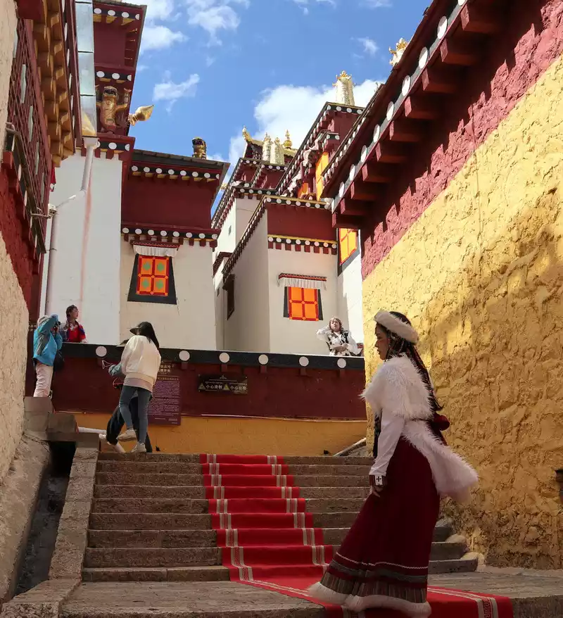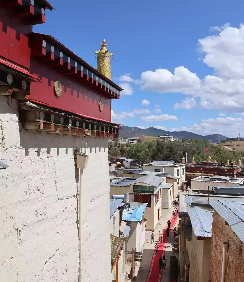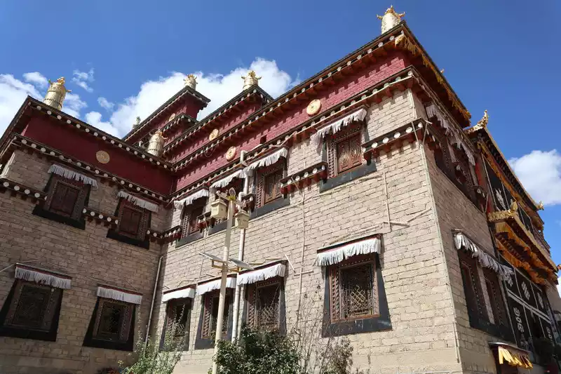 Songzanlin Monastery, modeled after the Potala Palace in Lhasa, is built along the mountainside, with layers of buildings rising in staggered steps. Set against the unique blue sky and white clouds of the plateau, it appears majestic and magnificent. The two main halls, Zhacang and Jikang, are located at the highest point and central to the monastery. The main halls are majestic and magnificent, with vibrant and delicate murals depicting historical events and promoting Buddhist teachings. Ganden Songzanlin Monastery, also known as Guihua Monastery, holds a pivotal position in Tibet. Construction began in 1679 (the eleventh cycle of the Tibetan calendar, the Year of the Earth Sheep) and was completed in 1681 (the Year of the Iron Rooster). The Fifth Dalai Lama personally bestowed the name "Ganden Songzanlin" upon the monastery. The monastery boasts a sturdy, thick, oval wall with five gates. The red plaque with golden characters "Ganden Songzanlin Monastery" was inscribed by Mr. Zhao Puchu, former president of the Buddhist Association of China and a famous calligrapher.