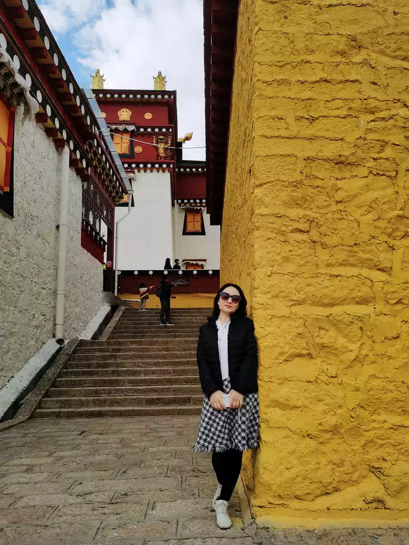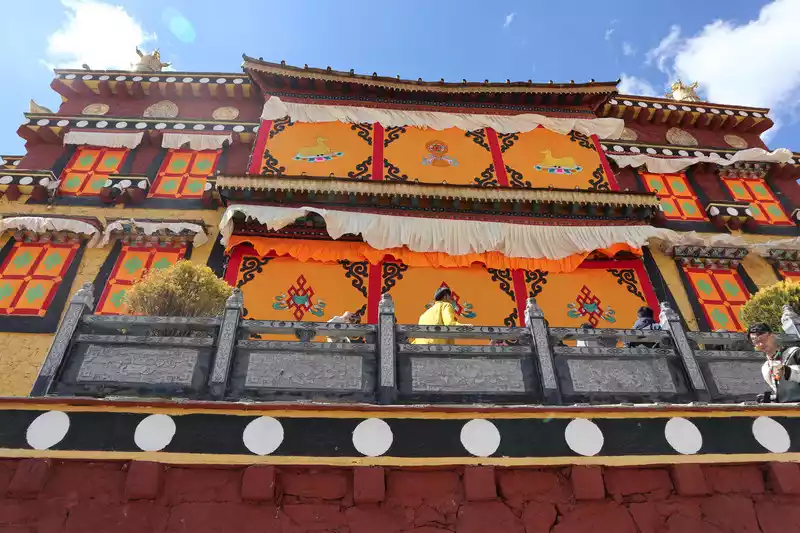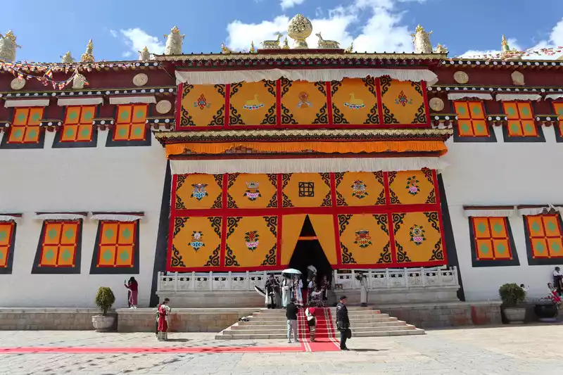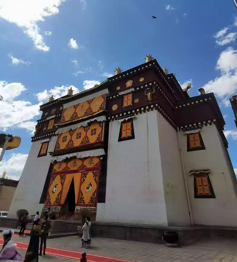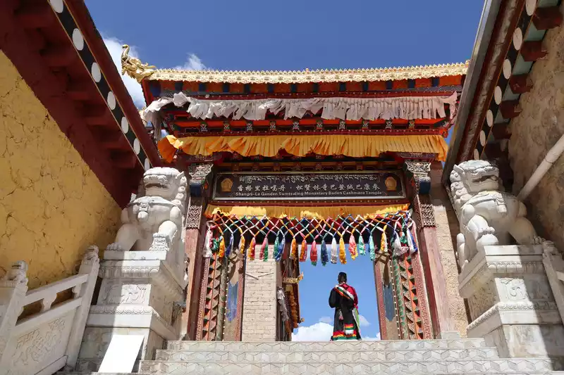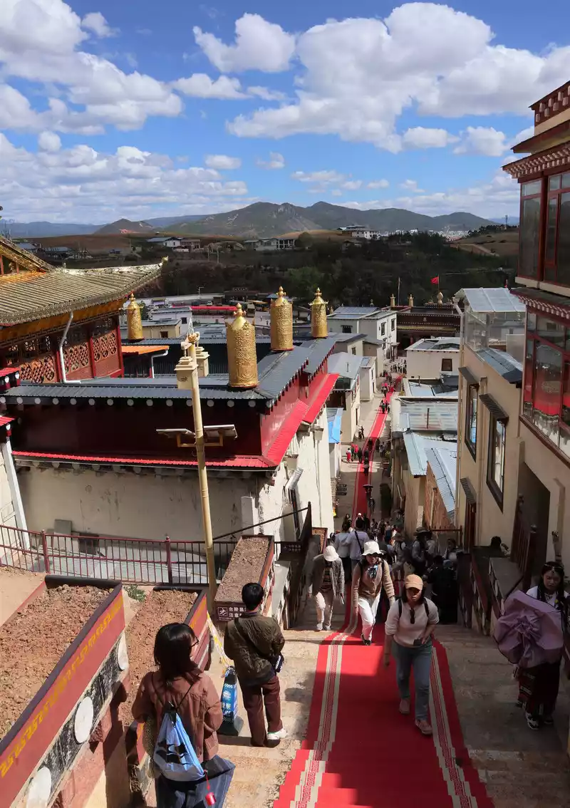 Songzanlin Monastery, modeled after the Potala Palace in Lhasa, is built along the mountainside, with layers of buildings rising in staggered steps. Set against the unique blue sky and white clouds of the plateau, it appears majestic and magnificent. The two main halls, Zhacang and Jikang, are located at the highest point and central to the monastery. The main halls are majestic and magnificent, with vibrant and delicate murals depicting historical events and promoting Buddhist teachings. Ganden Songzanlin Monastery, also known as Guihua Monastery, holds a pivotal position in Tibet. Construction began in 1679 (the eleventh cycle of the Tibetan calendar, the Year of the Earth Sheep) and was completed in 1681 (the Year of the Iron Rooster). The Fifth Dalai Lama personally bestowed the name "Ganden Songzanlin" upon the monastery. The monastery boasts a sturdy, thick, oval wall with five gates. The red plaque with golden characters "Ganden Songzanlin Monastery" was inscribed by Mr. Zhao Puchu, former president of the Buddhist Association of China and a famous calligrapher.