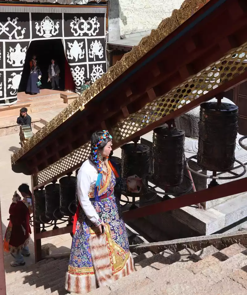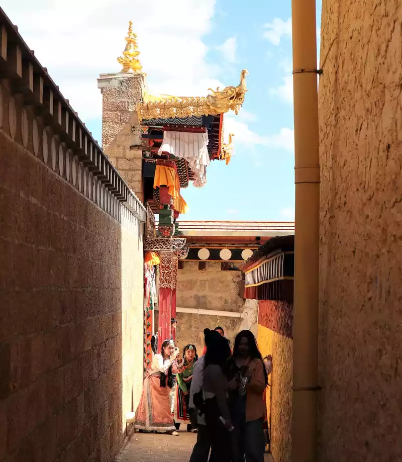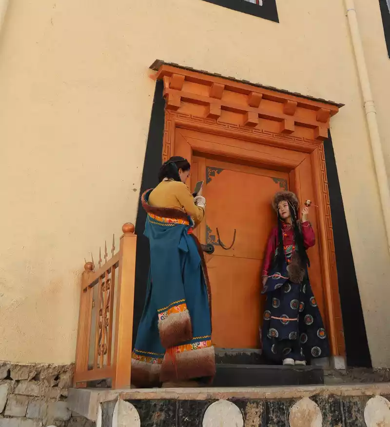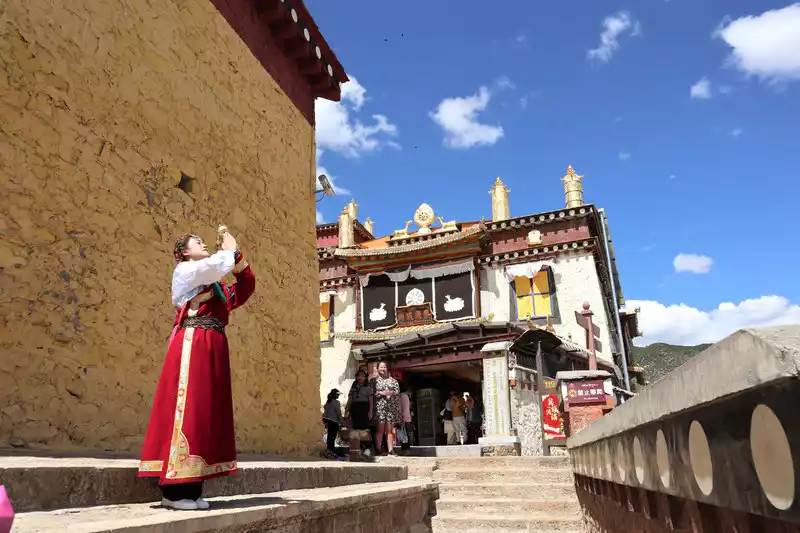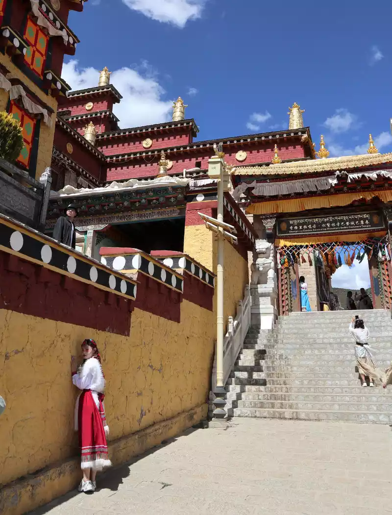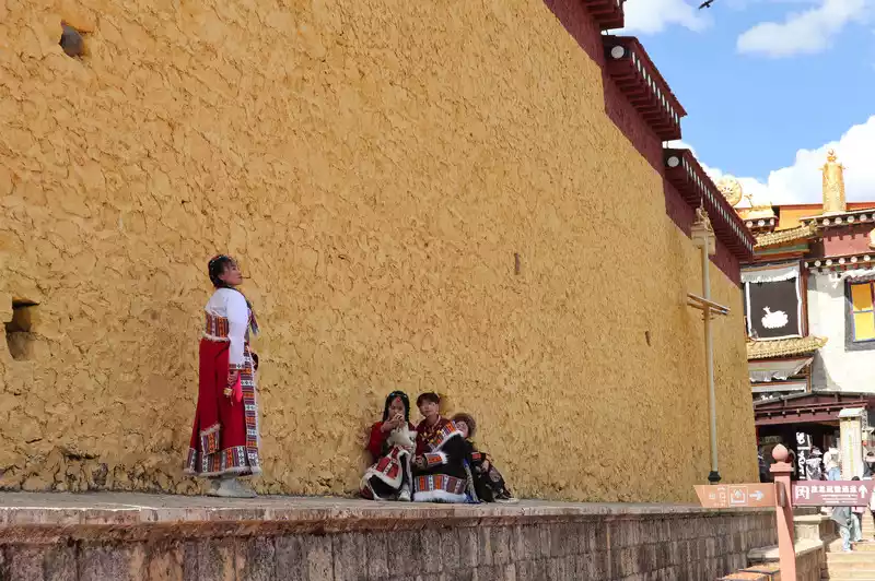 Many tourists (mostly girls) wear full sets of Tibetan costumes and pose in various postures for photos, which has become a new scene in the temple.