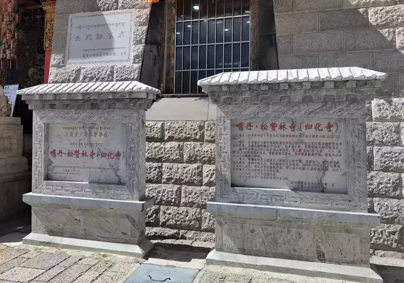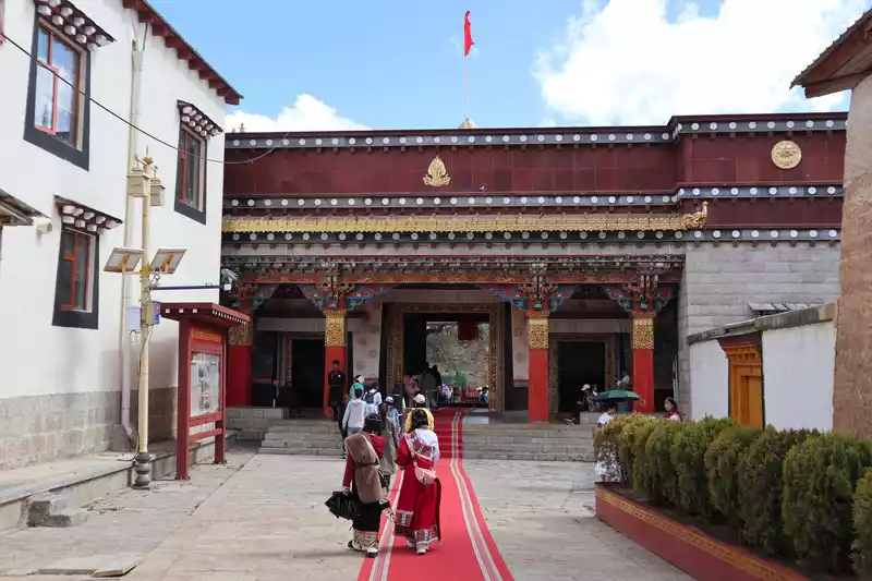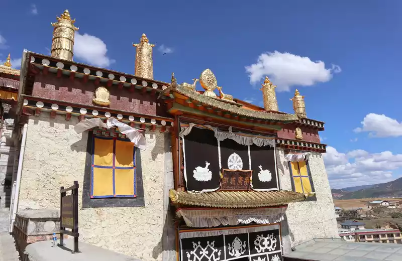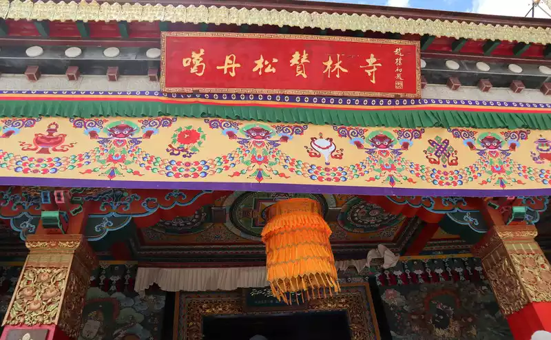 The red plaque with golden characters "Ganden Songzanlin Monastery" was inscribed by Mr. Zhao Puchu, former president of the Buddhist Association of China and a famous calligrapher.