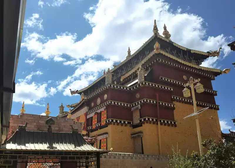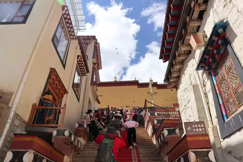 Similar to the architectural pattern of Tibetan Buddhism, the two main halls of Songzanlin Monastery, Zhacang and Jikang, stand majestically in the center, surrounded by eight Kangcan halls, monks' quarters and other buildings, which are arranged in a staggered manner with progressive layers and clear outlines, fully highlighting the grandeur of the main building. Climb 147 steps to reach the two main halls at the temple's highest point. The five-story, north-facing halls are carved into Tibetan style. The upper floors feature gilded copper tiles, and the corners feature ornate eaves with animal-shaped ornaments, reflecting the architectural style of Han Chinese temples. The lower hall boasts 108 pillars, representing an auspicious number in Buddhism.