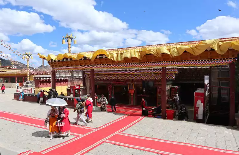 On both sides of the red-carpeted passage are square Tibetan-style buildings with distinctive doors, windows and eaves, carved and painted.