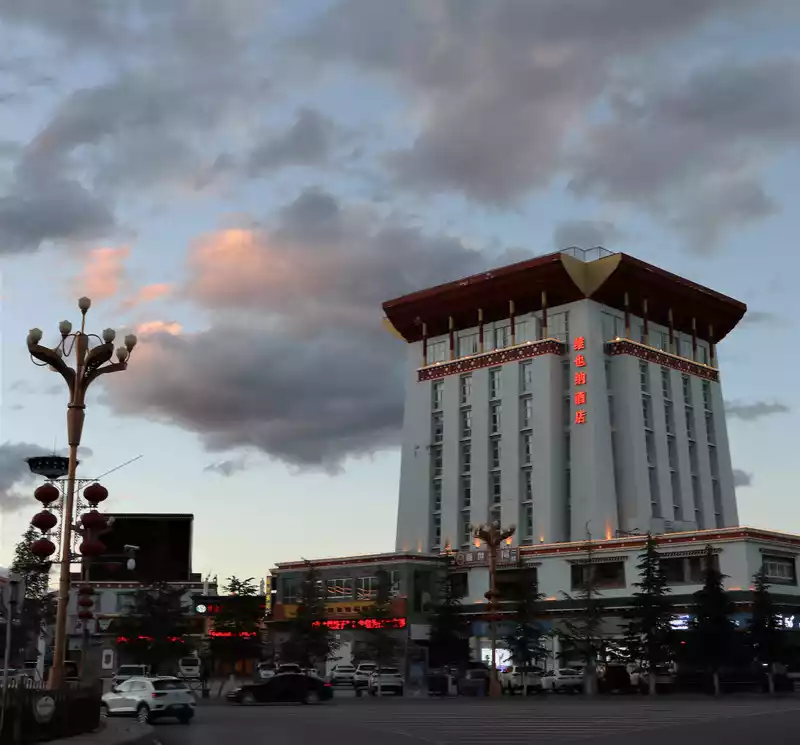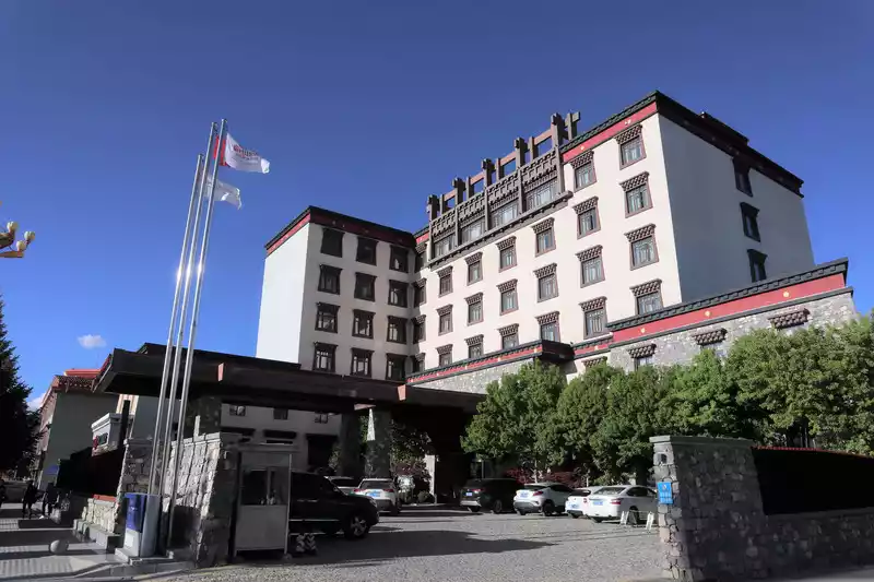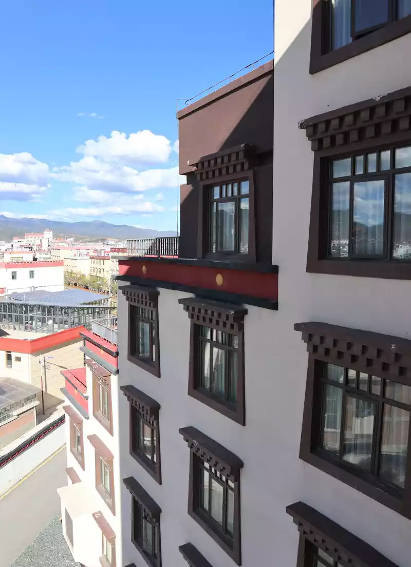 The Tibetan-style windows of the hotel building can be seen from the side.