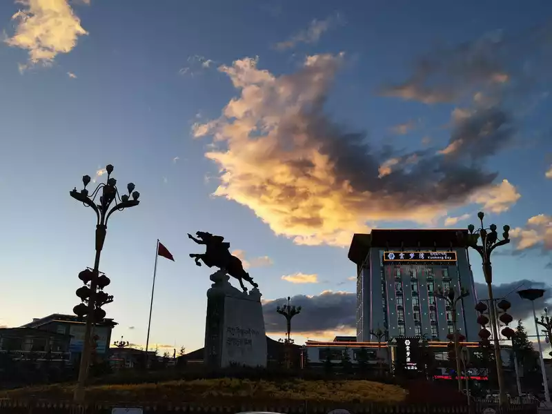 Between the two square and steady Tibetan-style buildings, there is a sculpture of a knight riding a horse at full speed. The silhouette effect is very attractive.
