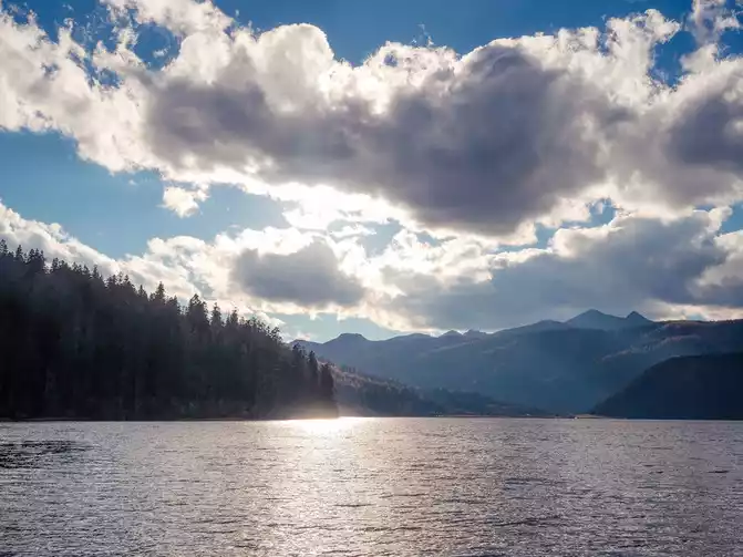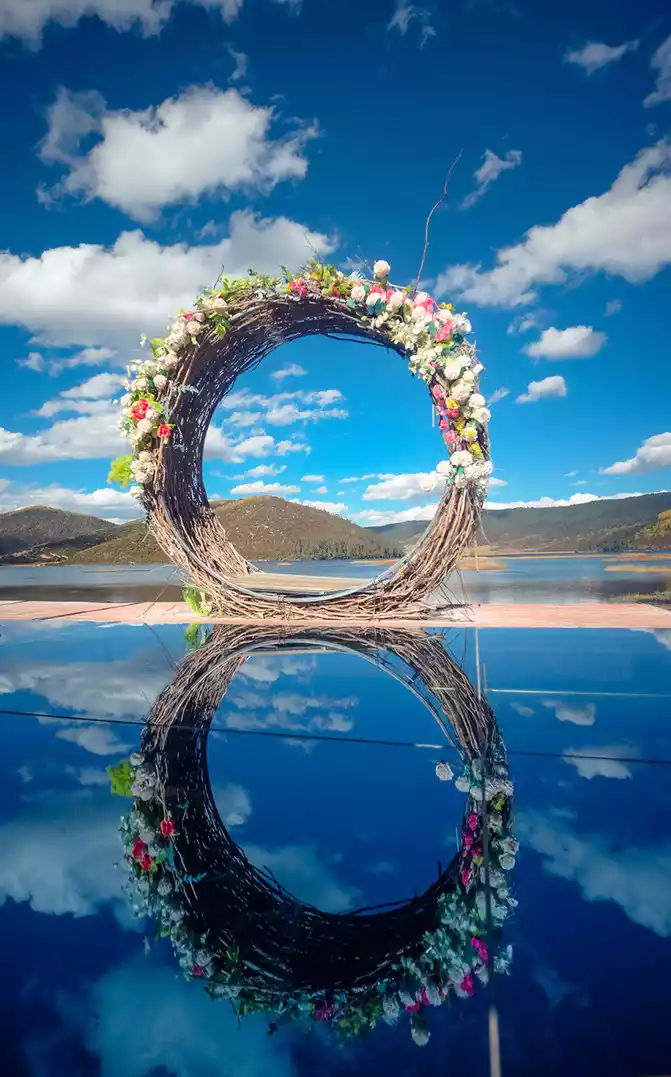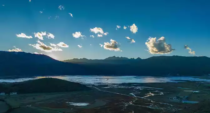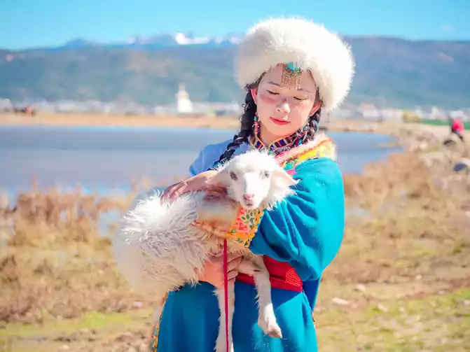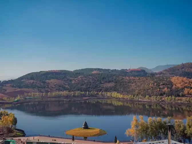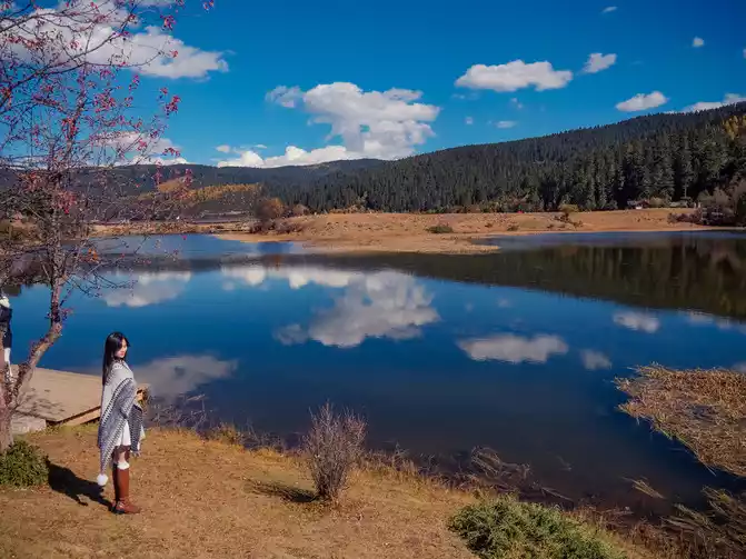 Next, guided by floating bridges and stone paths, you can stroll along the shores of Lhamoyangcuo Lake and enjoy the beautiful scenery. The lake's mirror-like surface reflects the clouds, while the Mani piles within it stand silently, like the embodiment of the gods. Standing here, you'll be astounded by the breathtaking scenery before you: the sky burial platform, the temple's reflection, the Mani piles in the lake's center, the sacred lake meadow, and the pastoral scenery of the manor. Lhamoyangcuo Lake is also a rare scenic spot. On a calm day, you can see the perfect reflection of Songzanlin Monastery.