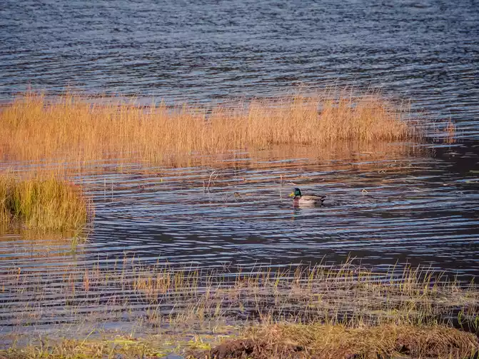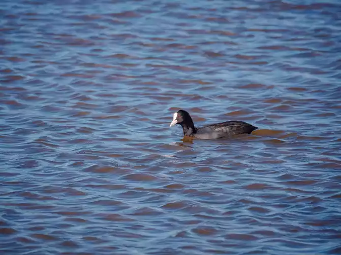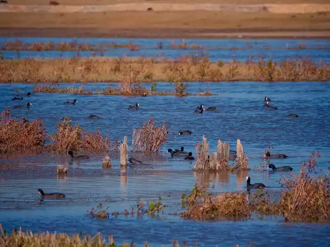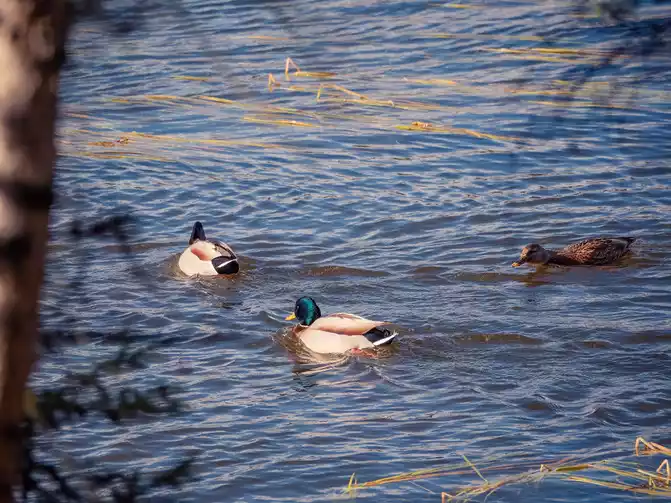 Yellow ducks and coots enjoy foraging in the grass by the lake, moving alertly around and taking flight at the slightest sign of movement.