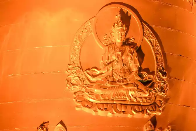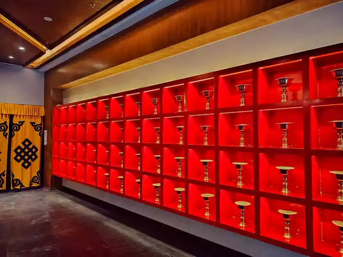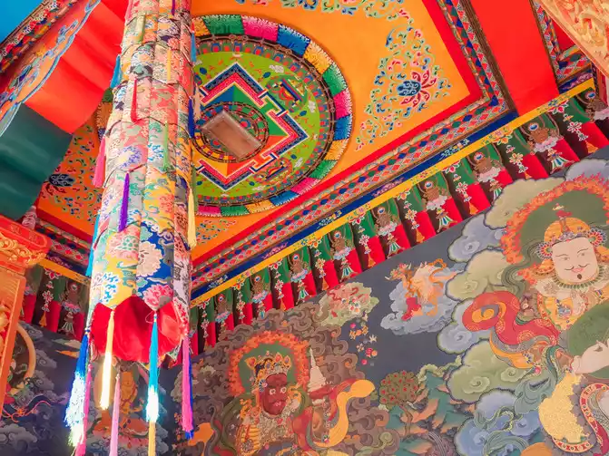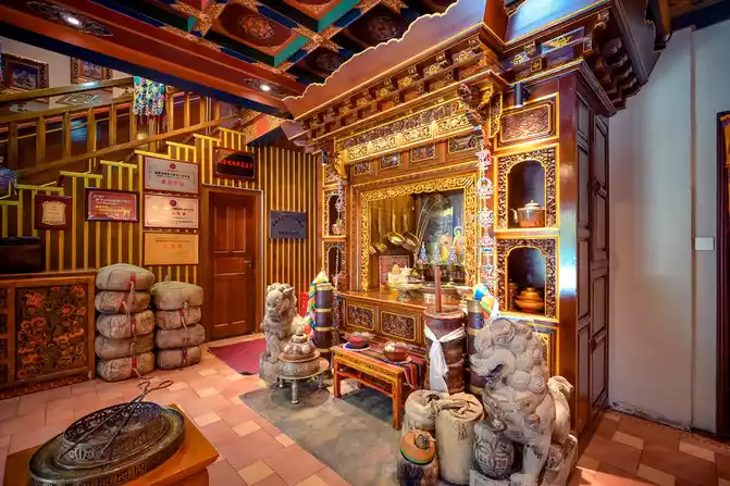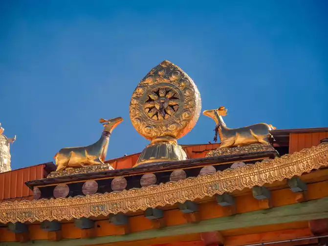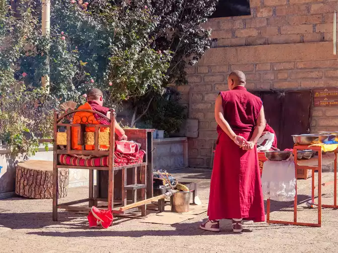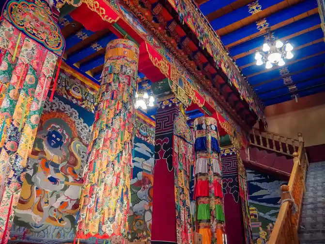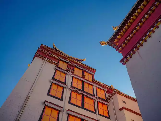 From the outside, this monastery's unique architectural style, with its red and white walls and resplendent golden roof, creates a striking visual impact. Inside, however, one is struck by a sense of tranquility and harmony. The prayer wheels, white pagodas, shrines, and monks—each element exudes a deep religious sentiment.