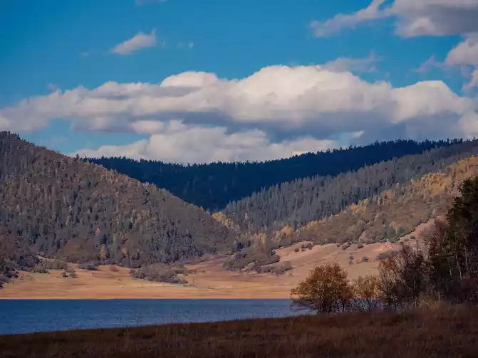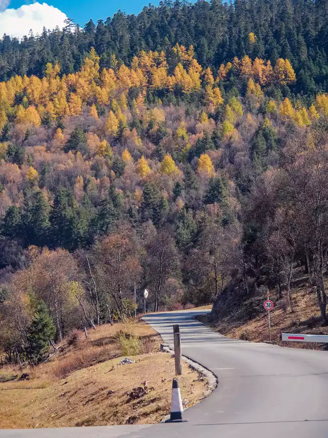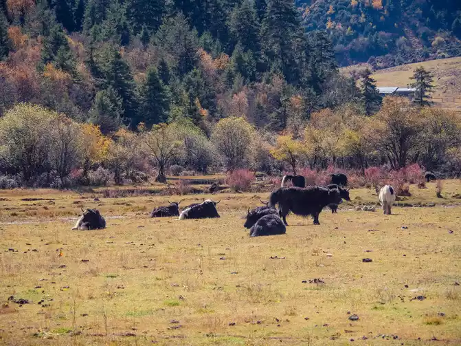 Autumn imbues the landscape with vibrant colors, offering opportunities for discovery and experience. Upon entering the park, a sea of golden and emerald green greets the eye. The golden leaves contrast sharply with the towering pine trees, as if nature has draped the earth in a magnificent brocade. Countless yaks and goats are grazing peacefully on the grassland!