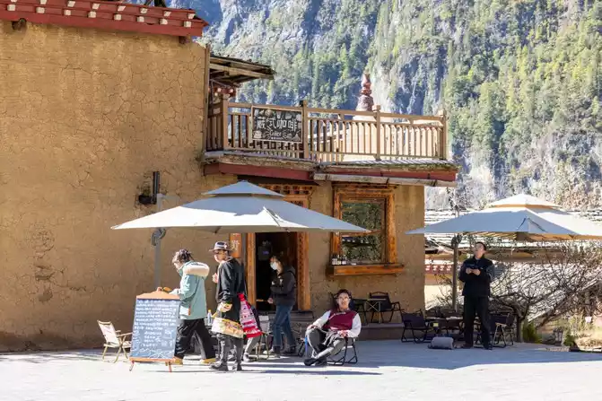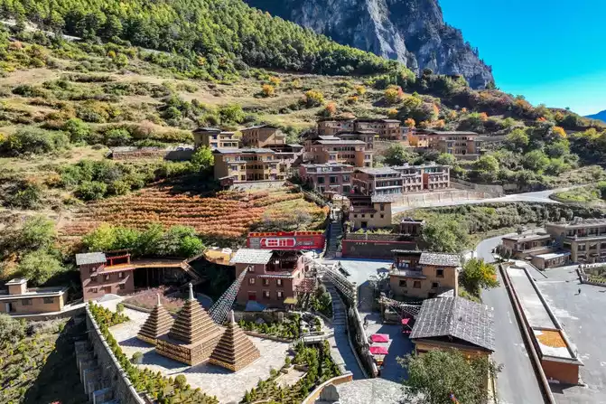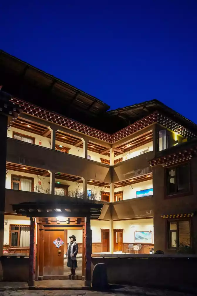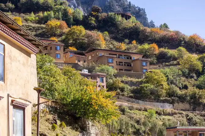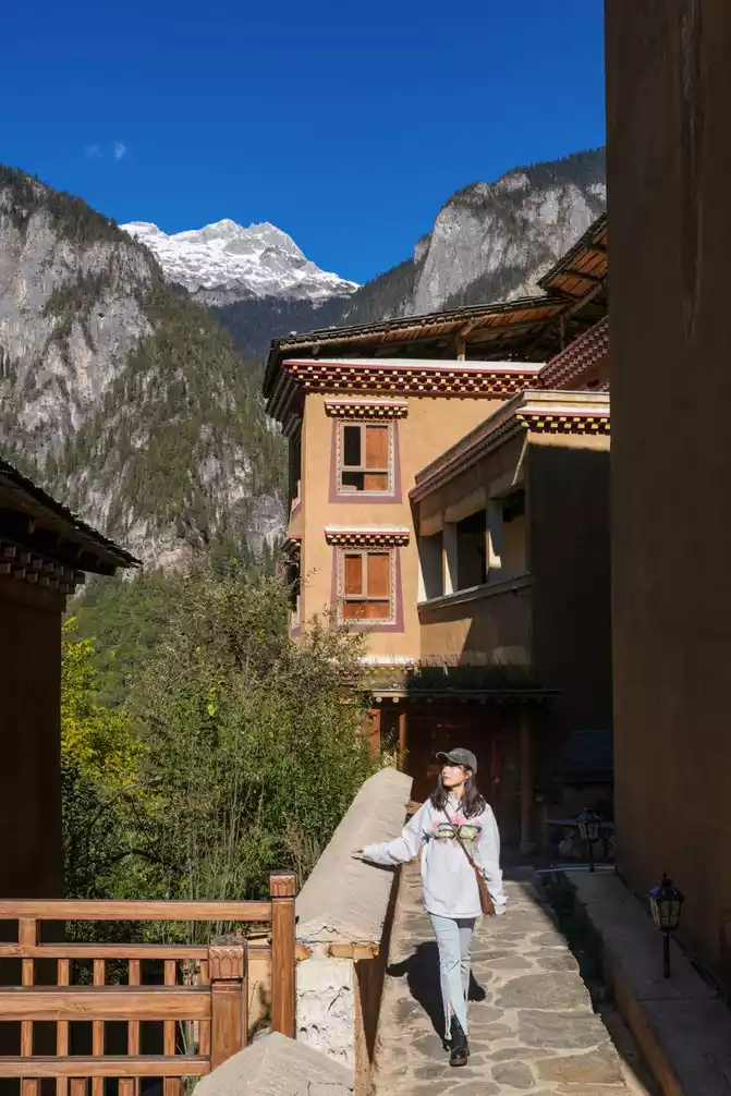 Sina Dingzhu is a high-end Buddhist culture-themed hotel. It is a very shocking hotel, located halfway up the mountain. If you come in late September, it will be surrounded by snowy mountains. The room is very big, and the staff who got off the bus presented Hada. The hotel is in Bala Village. You can go to the village for a stroll through the door. The mountain spring flows along the village and it is very quiet at night.