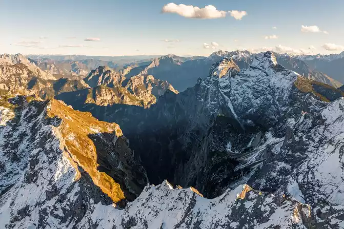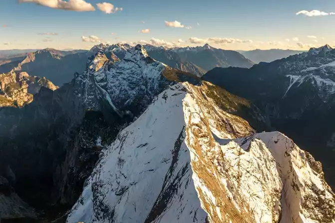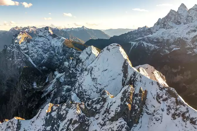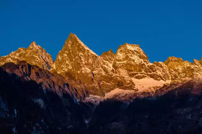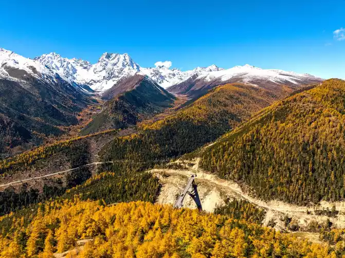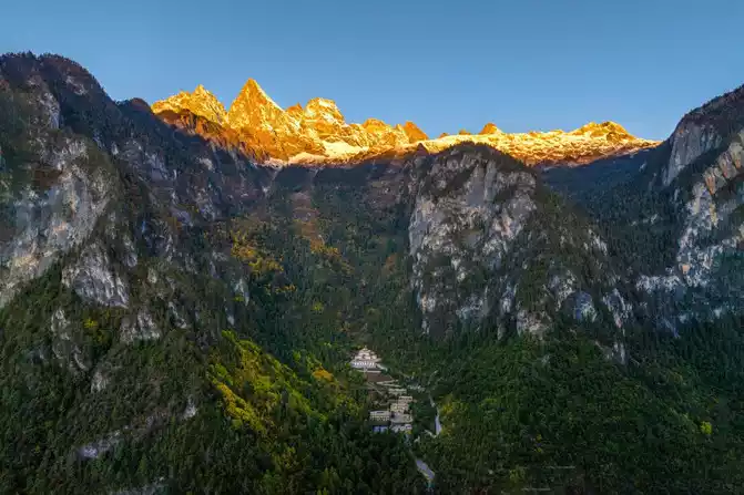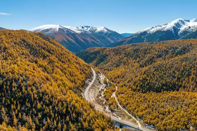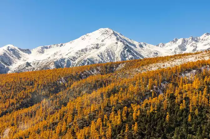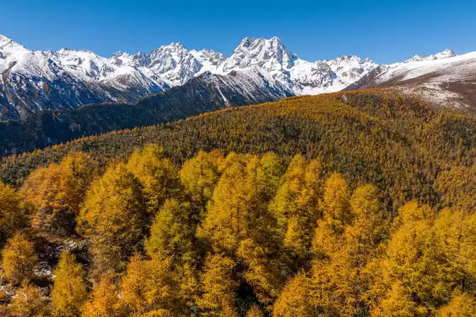 Located in the middle section of the Hengduan Mountains, the Baima Snow Mountain forms the watershed between the Lancang and Jinsha Rivers. It lies at the junction of Yunnan, Tibet, and Sichuan. In late autumn, the alpine coniferous forests of the primeval forests turn golden, with countless fallen pine needles piled like a carpet. Tall, straight pine trees stand densely on the cliffs, their shimmering golden light expanding like waves, surging from high to low. Against the backdrop of the plateau's pristine blue sky, clear sunshine, and pristine white snow, the vibrant colors of the forests radiate – this is the true essence of autumn!