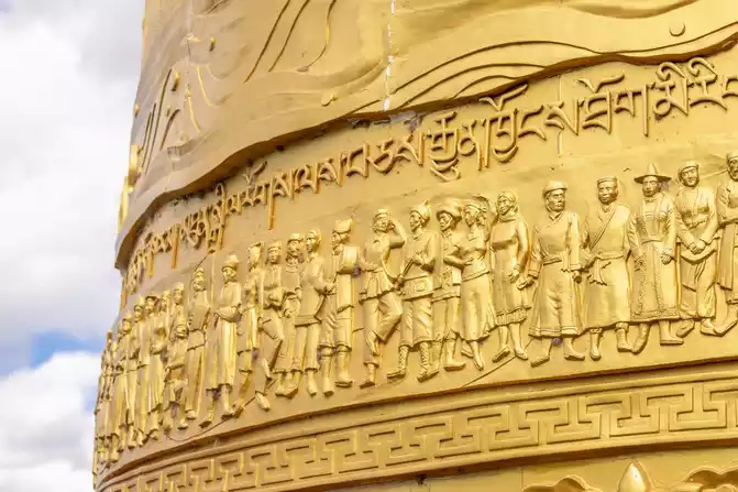 The mountain in the scenic area resembles a round pagoda, so people also call this naturally formed pagoda a "natural pagoda" and is one of the main landscapes in the scenic area. Shambhala Pagoda is located in the northeast of Gezong Snow Mountain. Its mouth is 4,250 meters above sea level. The natural pyramid-shaped peak is covered with white snow and stands majestically in the sky. Next to it are the "Lama Squatting Statue" and the "Sutra Statue". These three peaks are known as the Three Treasures of Buddha, Dharma and Sangha. They are the sky-limited pagodas predicted by the Buddha Sakyamuni after he became a Buddha. They are also spiritual mountains that can eliminate people's own turbidity and evil obstacles.