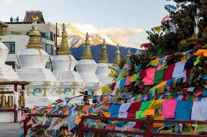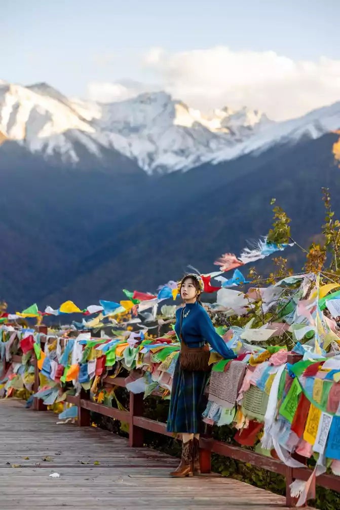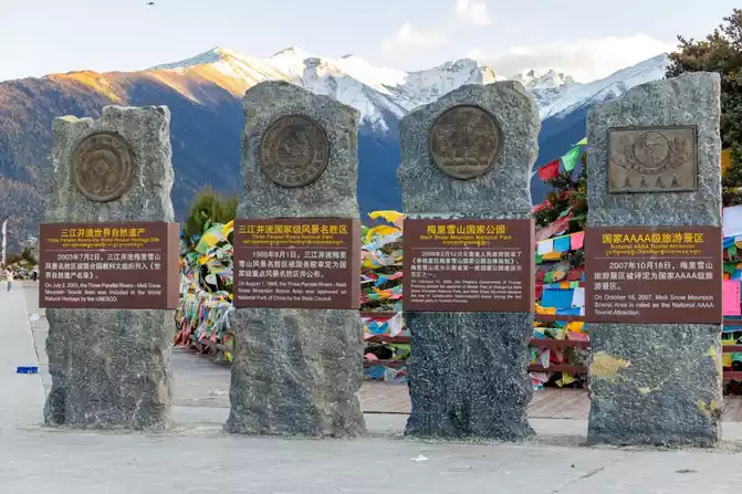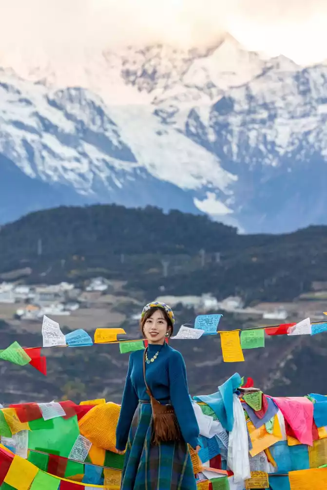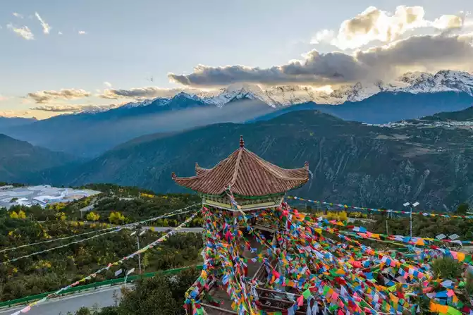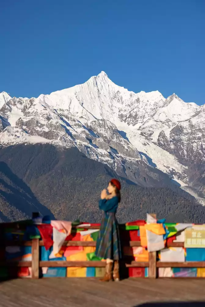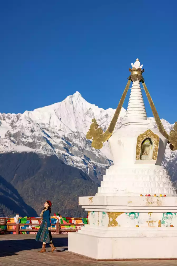 There are two main viewing platforms for viewing Meili Snow Mountain, one is Wunongding Viewing Platform and the other is Feilaisi Viewing Platform. The Wunongding Observation Deck, also known as the Thirteen White Pagodas Welcoming Deck, is located in Wunongding Village, hence its name. The view of Meili Snow Mountain from this spot is even more majestic, offering a wealth of photo opportunities.
