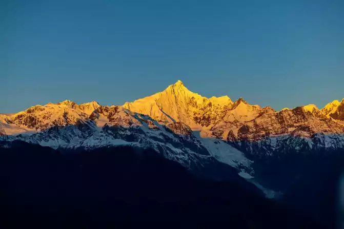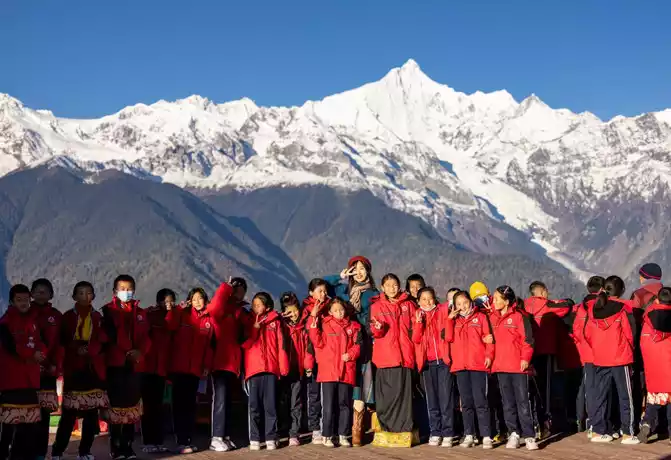 You don't have to get up early to visit the Wunongding Observation Deck; you can see the Meili Snow Mountain from the rooftops of all the hotels and guesthouses in the area. By 6 a.m. the next morning, the rooftop of our hotel was already packed with people, and we hadn't expected to see such a saturated and visible view of the golden mountain. By daybreak, we walked to the observation deck, where it was already packed with people. Local children, curious, came running to ask for photos. Under the gaze of the sacred mountain, the morning began with such a lively atmosphere. Kawagebo Peak, the main peak of Meili Snow Mountain, stands at 6,740 meters, the highest peak in Yunnan. It remains unconquered by climbers and is the only peak prohibited for climbing due to cultural protection. Anyone who has done their homework will have heard of the mountain disaster that occurred there. After the Sino-Japanese joint mountaineering team's mountain accident, rumors circulated among the people that Kawagebo happened to be in Tibet to hold a mountain god meeting. When he came back and saw the climbers, he was furious and buried them. After that, all kinds of strange things happened, including villagers getting sick, livestock dying, mudslides and avalanches, which were all punishments from Kawagebo. It may sound overly superstitious, but who can explain the power of nature beyond science? With awe and the attitude of "better to believe than not to believe," Kobayashi Naorei of Beijing University's Department of Mountain Studies continued to try to understand what had happened. He visited Meili Snow Mountain again in 1996, lived in a village at the foot of the mountain, and wrote the book "Meili Snow Mountain." "Kawagbo embraces a complete world. The monsoon is blocked by the peaks, resulting in heavy snowfall, which in turn gave birth to glaciers and forests. Thanks to the nourishment of this glacial water and forests, people in arid areas can survive and reproduce. All living things here exist under the protection of Kawagebo."