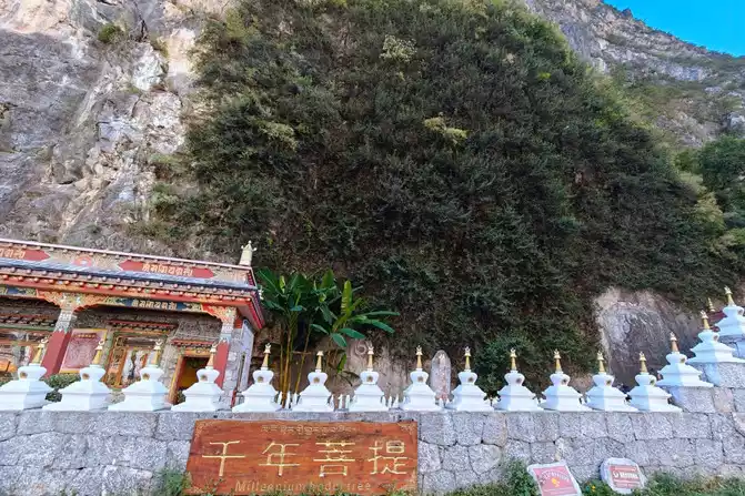 A bodhi tree stands tall on a cliff face in the Balagzong scenic area, its trunk seemingly clinging to the cliff face. Its branches and leaves, like a phoenix's tail, stretch across the cliff face, covering nearly 400 square meters of rock face. This bodhi tree nestles tightly against the cliff face of Balagzong. This thousand-year-old phoenix bodhi tree is the symbol and guardian of Balagzong.
