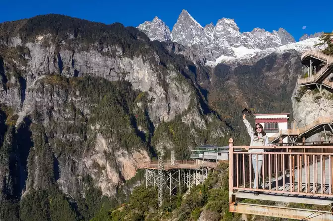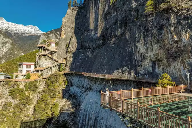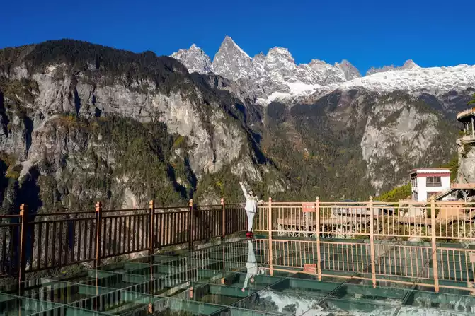 The glass platform with a drop of 700m, stepping on the cliff, and the even more frightening hollow plank road, it has a strong sense of experience and is very fun to go with a group of people. When there are few people, you can lie down and take photos with the snow-capped mountains and rivers.