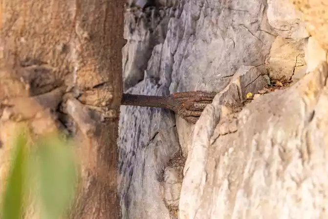 Millennium Bodhi Tree: Growing on the cliff face, a bodhi tree appears to cling to the cliff face, its branches and leaves resembling a phoenix's tail, covering nearly 400 square meters of rock face. Even more magical is the sight of a "hand" sprouting from the tree's waist and reaching into a crevice. Its branches resemble an arm, its twigs fingers, like the hand of an old man with a vicissitudes of life.