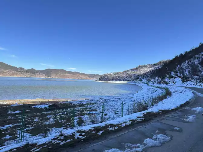 We wanted to visit Upper Tiger Leaping Gorge and White Water Terrace along the way, so we chartered a car to Shangri-La on a friend's recommendation. The experience was worth it. The local roads are dangerous, with numerous 180-degree turns and rockfall. It snowed a week before our arrival, and the snow on the Yinshan Mountains had turned to ice on the road. The chartered car driver, a Lijiang native, nearly skidded several times. Drivers on the road were courteous and slowed down when passing other vehicles, even giving oncoming drivers a heads-up. Such a kind person. The picture below was taken at the Wild Observation Deck on the way from Lijiang to Tiger Leaping Gorge.