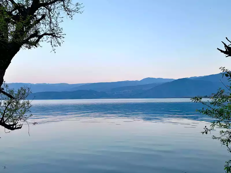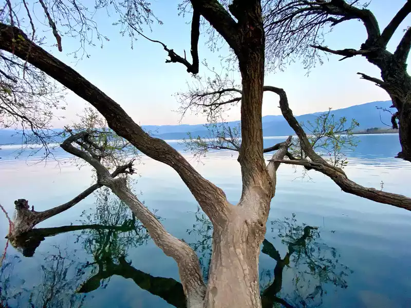 Bottomless Lake, like a turquoise bead, is nestled in the heart of a mountainous landscape. Other attractions are scattered around it. In front is a large meadow where you can bring your own tent for camping. To the left is a primeval forest; to the right is a pasture area; and behind is a region of worry-free trees. When we first entered Bottomless Lake, it felt as if it burst into our eyes. It was so beautiful and breathtaking. My brother said that now isn't the most beautiful season yet; it's even more beautiful in summer. However, every season has its own unique attractions, and we're incredibly satisfied with what we've seen so far. The tent camp is in front of the lake, on a large lawn. You can bring your own tent and stay for a night for a small fee. There's also a tent hotel nearby, but I heard it's a bit pricey, with different tents offering different prices. We just glanced at it from a distance and passed by. The Worry-Free Tree is a large, round tree. I imagine it's at its most beautiful in summer or early autumn, when it's covered in green or red leaves. Wearing ethereal Hanfu (Chinese traditional clothing) and taking a photo next to the Worry-Free Tree would be quite stunning.
