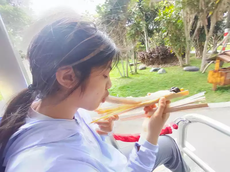 While waiting for the sightseeing bus, Tutu hurried to find something to eat and bought himself a bamboo tube rice dumpling! For lunch, he bought roasted sweet potatoes, corn, and drip coffee in the park! The sweet potatoes and corn were 10 yuan each, and the coffee was 25 yuan.