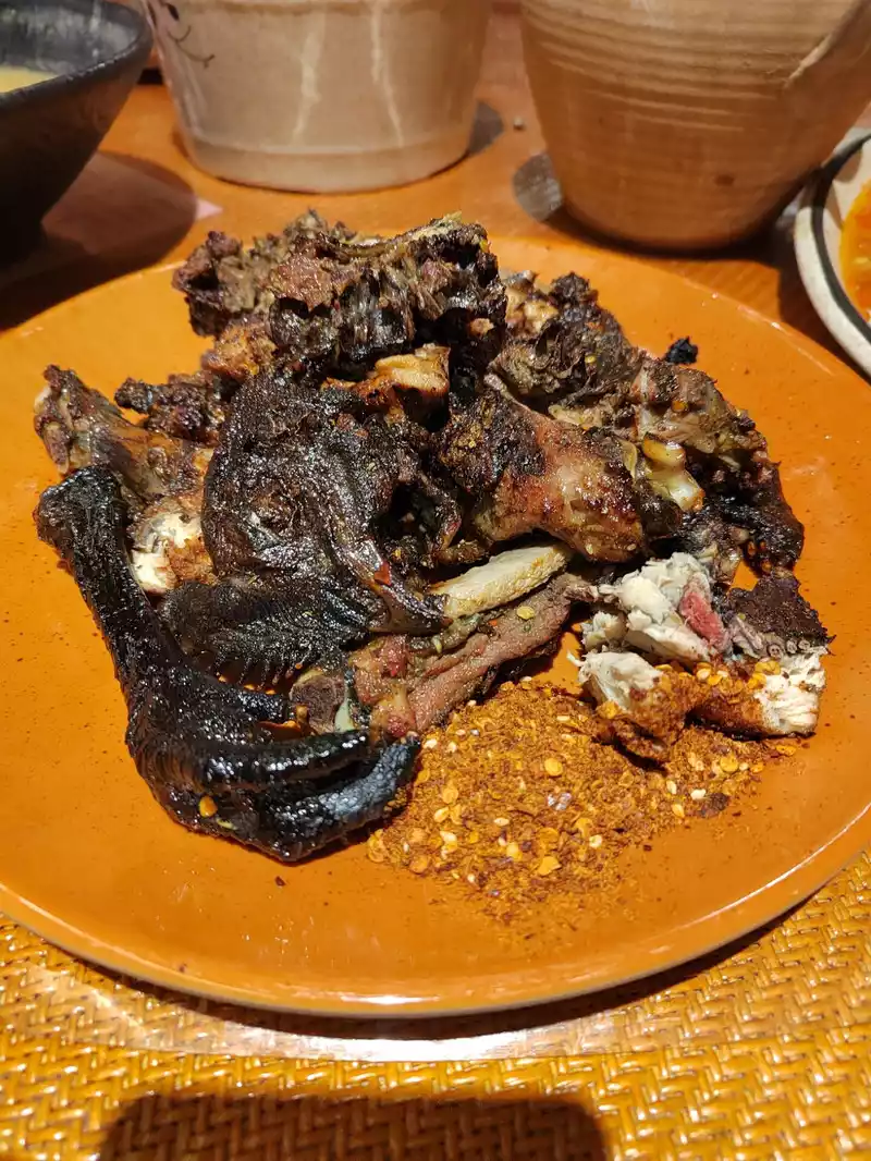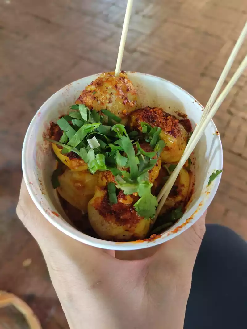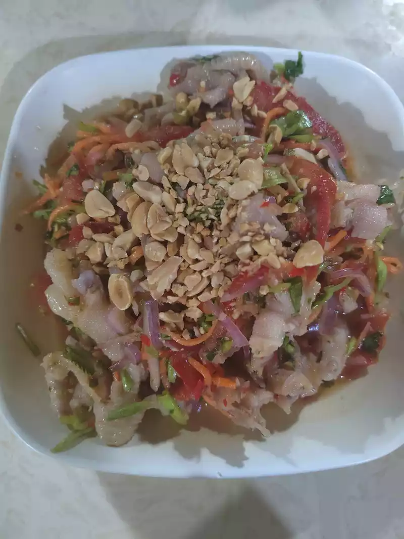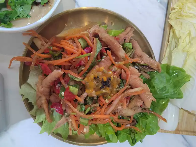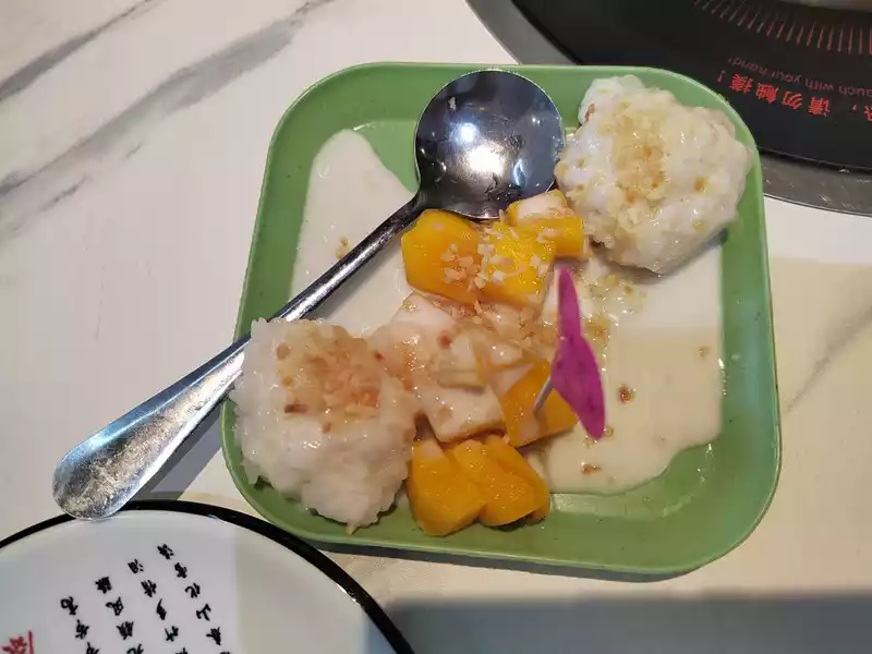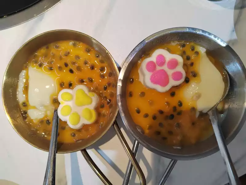 For lunch, we had passion fruit hotpot. Tutu doesn't like spicy food, so our hotpot was only sour and not very tasty. Would spicy and sour be better? Her spring chicken feet were very delicious, and the desserts were amazing. I recommend it five stars! The mango rice was not tasty!