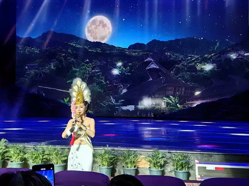 The Mengbala Naxi Bonfire Evening was divided into three parts. The first part was the Golden Peacock Night Mengbala Naxi song and dance performance. The picture shows the entrance to the song and dance performance. This new theater, seating 2,500, is Xishuangbanna's first 3D live-action stage. The evening's lighting and choreography were designed by Sha Xiaolan, a world-class lighting and choreography master and the team behind the Beijing Olympics opening ceremony. The large-scale performance blends Xishuangbanna's indigenous ethnic minority songs and dances, Southeast Asian folk customs, with modern artistic expression.