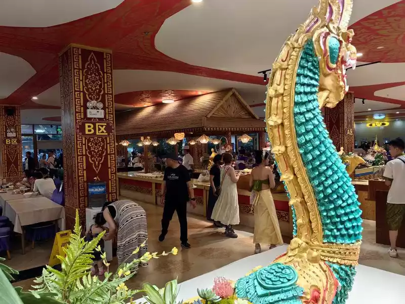Many tourists took photos in ethnic minority costumes. There will be a Dai buffet before the party, where you can enjoy a variety of local delicacies.