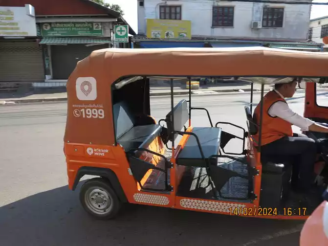 After leaving That Luang, my wife called a tuk-tuk through the software to go to the Arc de Triomphe in Vientiane. This car is a bit interesting, similar to domestic battery cars used for transportation in scenic spots. Shuttle on the road, you can go to various places, there are four of us in a car, and we have confirmed several times for a distance of about 3 kilometers. The total charge from point to point is 5,000 kip, and it is not charged per head.