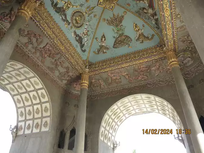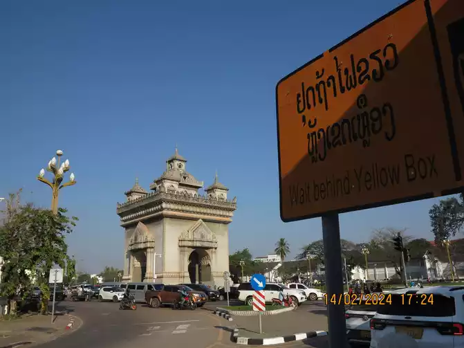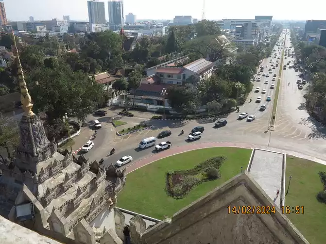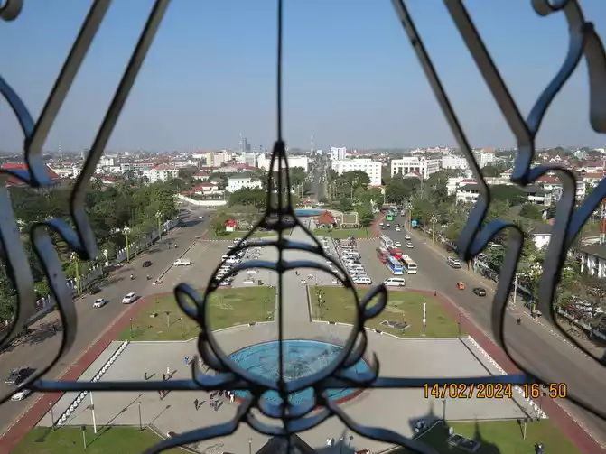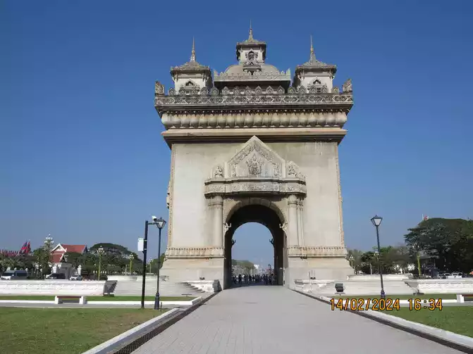 The English name of the Laos Arc de Triomphe is Patuxay, 45 meters high and 24 meters wide. It is located in the center of Vientiane. Along the main road is the Presidential Palace at the end. Construction started in 1960 and was basically completed in 1969. It is a large monument.