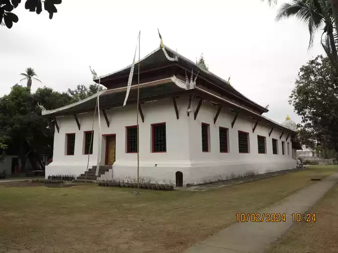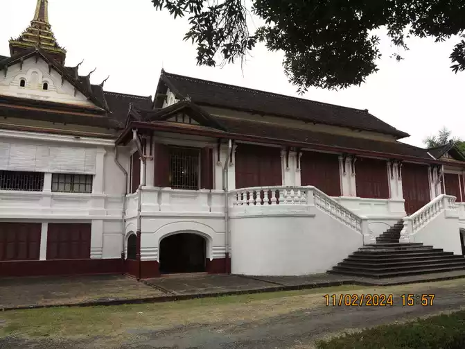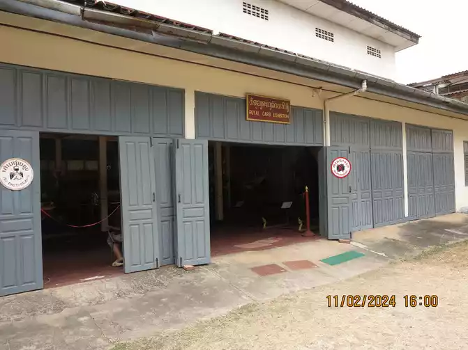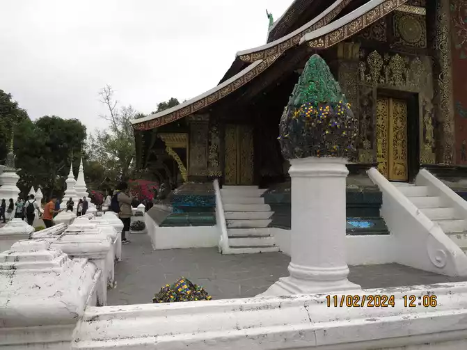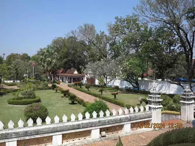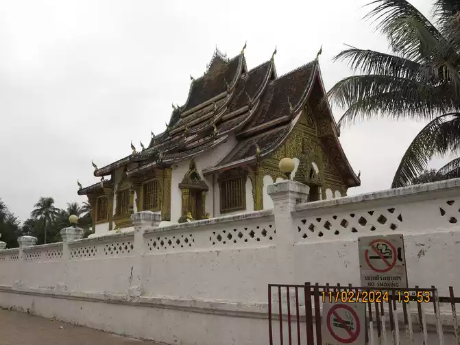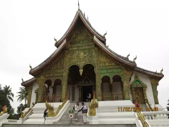 The Royal Palace opened at 1:30 pm, and we went in for a tour. The Royal Palace Museum, built in 1904 and located in the city center, was originally the residence of King Sisavongvong. It served as the residence for successive kings until the monarchy was abolished in 1975, when the palace was converted into the Royal Palace Museum. A statue of King Sisavongvong can be seen on the left side of the courtyard. The building on the right is magnificent, housing a golden Buddha. This statue was a precious gift from the Khmer Empire to King Fa Nguyễn, the founding king of the Lan Xang Kingdom, in 1356. It was named "Prabang," hence the name of Luang Prabang. Visitors can only view the temple from outside, but are not allowed to enter. The gatekeeper said they could place money on a plate and bring it inside. Fine! I put a small amount in to make merit. The large building in the center of the courtyard is a museum, housing items and decorations from the king and queen, as well as their bedrooms. It's not very large overall, but the exhibits are quite exquisite, offering a good opportunity to learn about Laotian history.